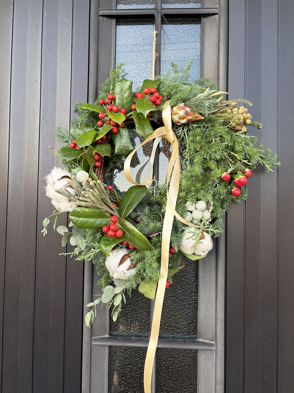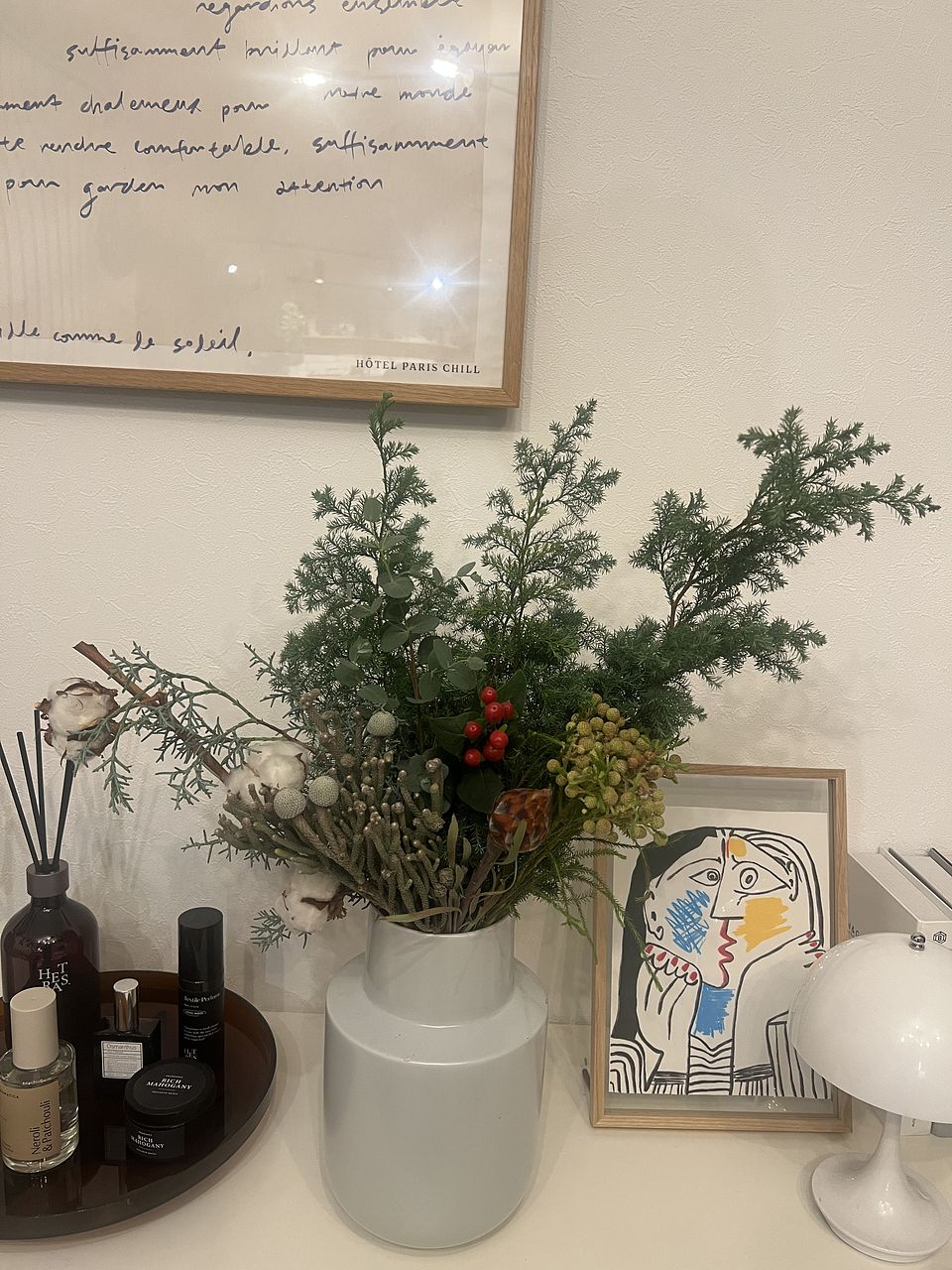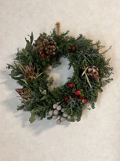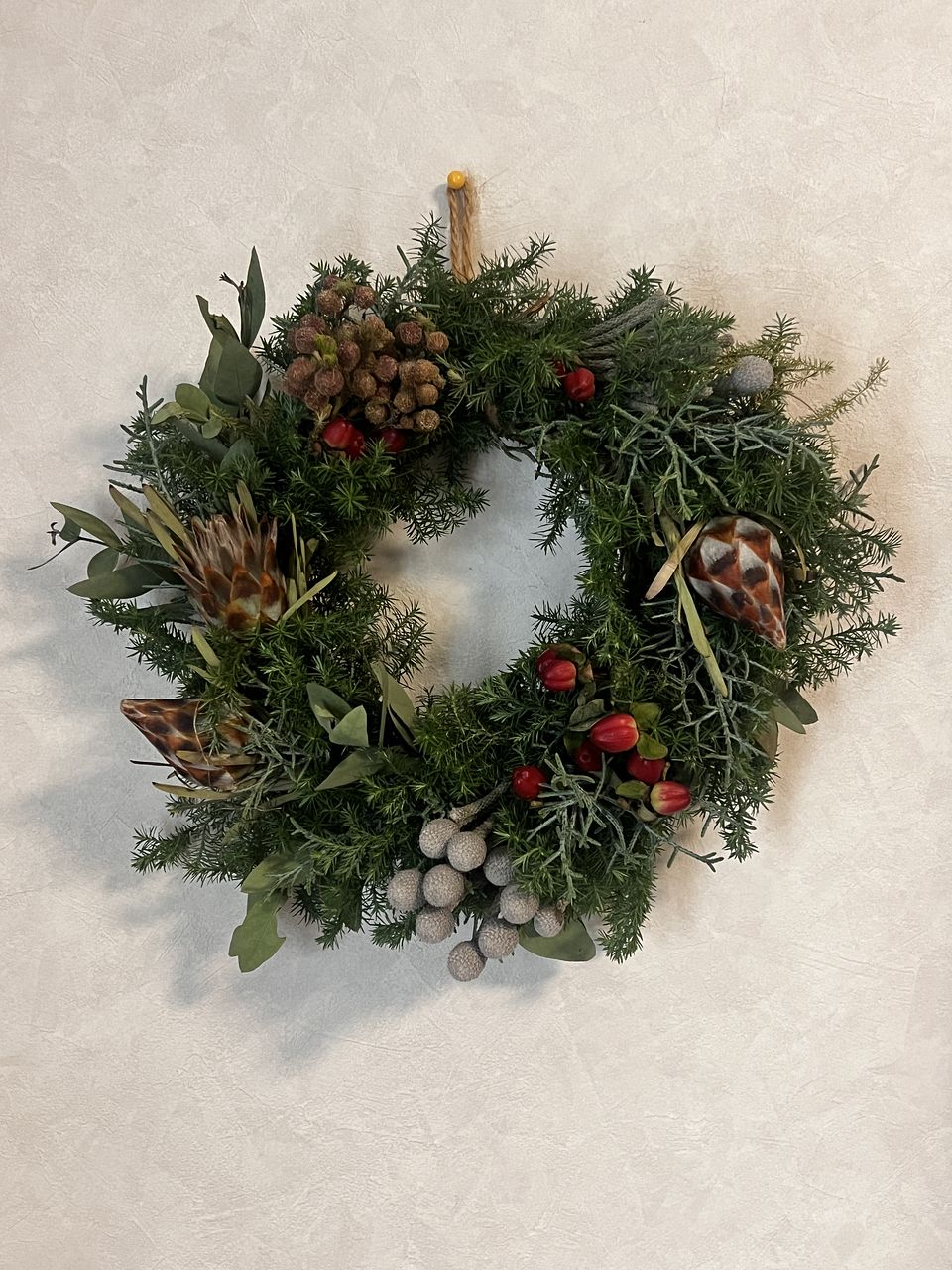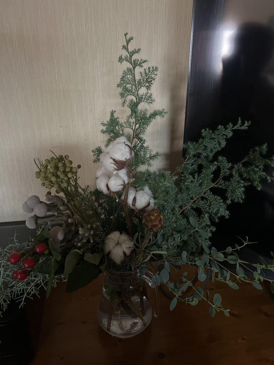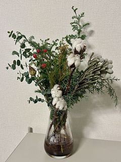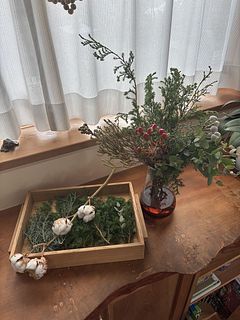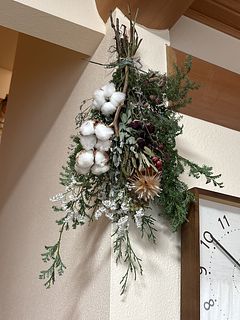 クリスマス前の楽しみです。 飾って楽しんでいます。花瓶に入れられないものは、リースにしようか、ガーランドにしようか思案中です。 少し花材を足して、リースとスワッグにしました。自分作るからでこぼこはありますが、楽しい時間でしたー。