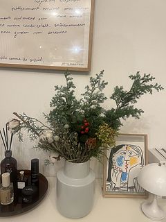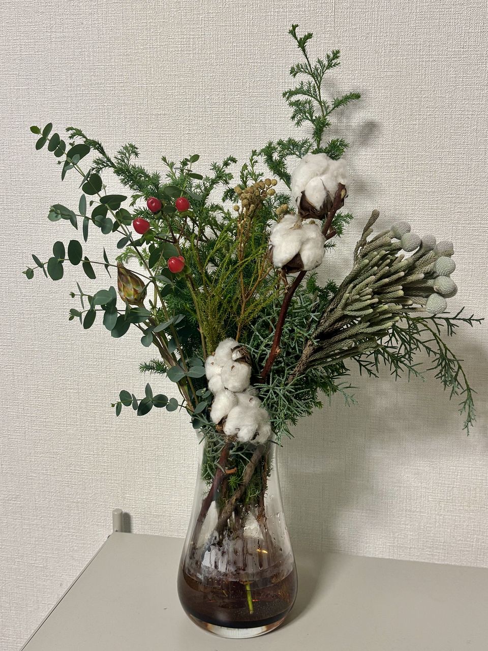ボリュームが想像していた以上でした! 花瓶に入り切らず、数本抜いて、別の花瓶でも飾っています🎄ヒペリカムの赤い実は全部で5つのみだったので、それがもう少し多かったら更に華やかだったかなと思います。