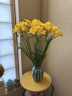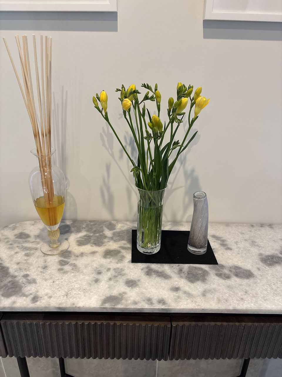 フリージアの香りが大好きで 玄関に飾りました♪ 入って来るとふわっと香り 気分が上がります😊