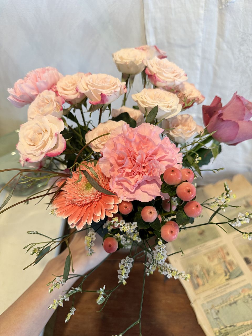 スプレーローズがたくさんでこちらが花開いてくれば、ピンク率があがるかなと楽しみです。 アンティークローズとガーベラがそれぞれ1本ずつで 写真の通りで素敵です!届けて頂けるのも手間なくて嬉しいです おすすめです