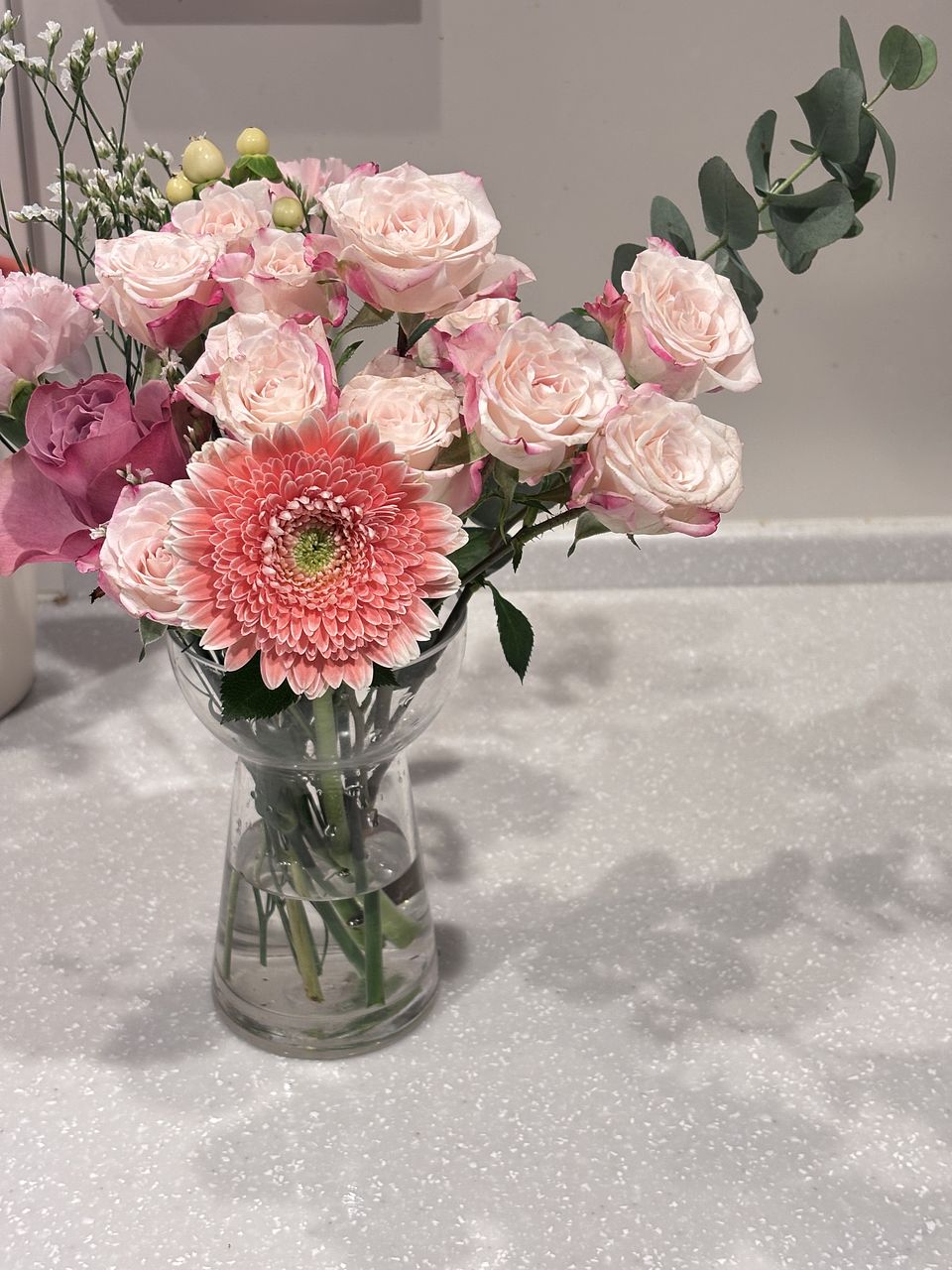 ボリュームがあって、花と緑のバランスも良かったです ただ、受け取った時にはすでにミニバラがしおれていて、すぐに枯れてしまったのが残念でした