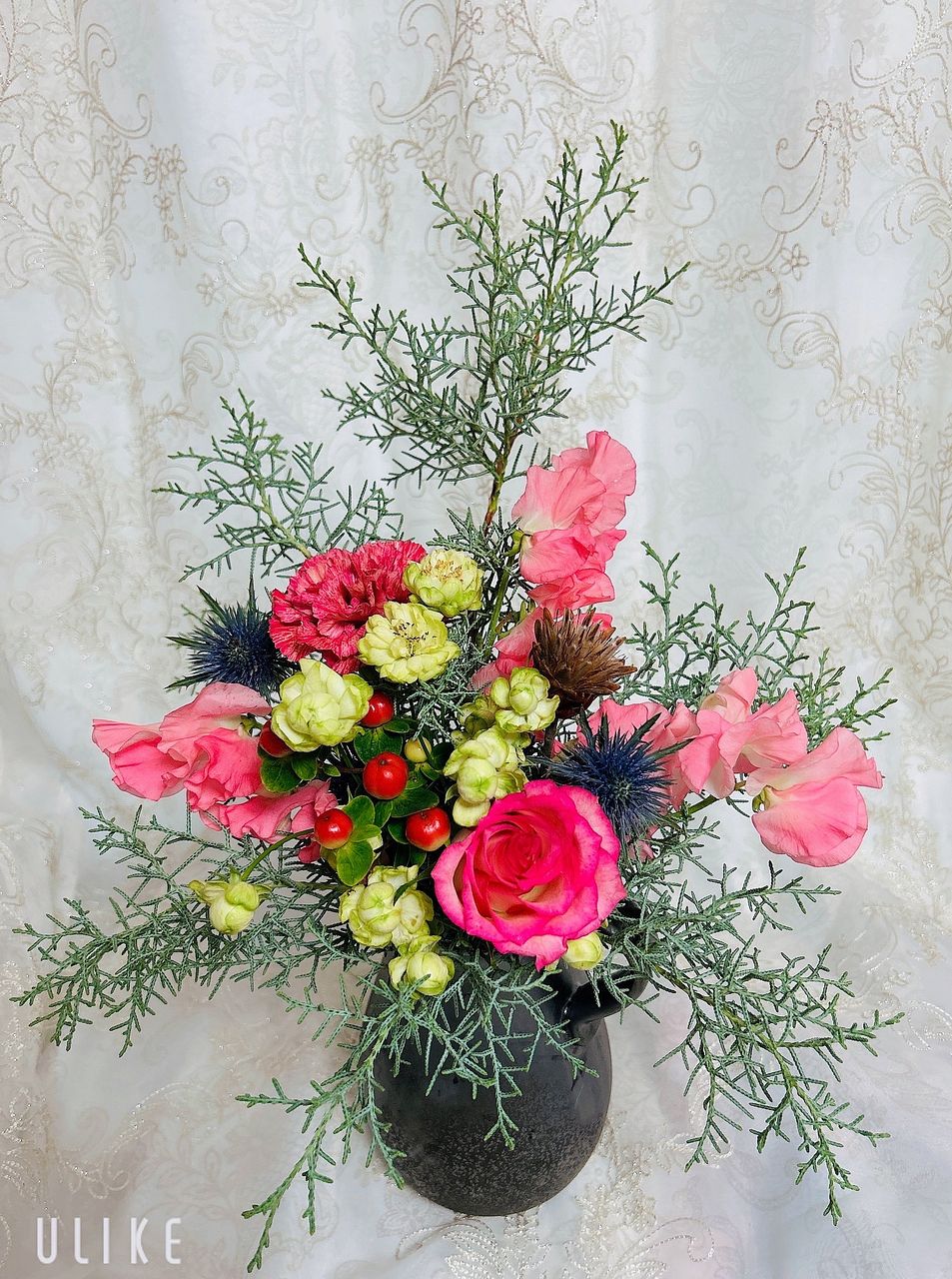 サーモンピンクのお花がほんのり温度を足してくれて、飾るだけでクリスマスまでの毎日がちょっと楽しくなります。