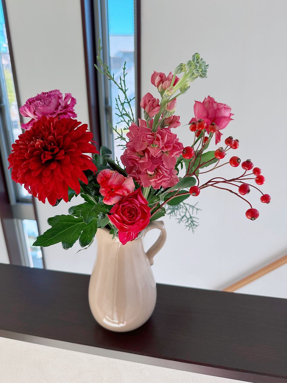赤く色づくバラの実やマムなどレッドからアンティークピンクのお花を集めました。季節の彩りをお部屋に飾ってみませんか?