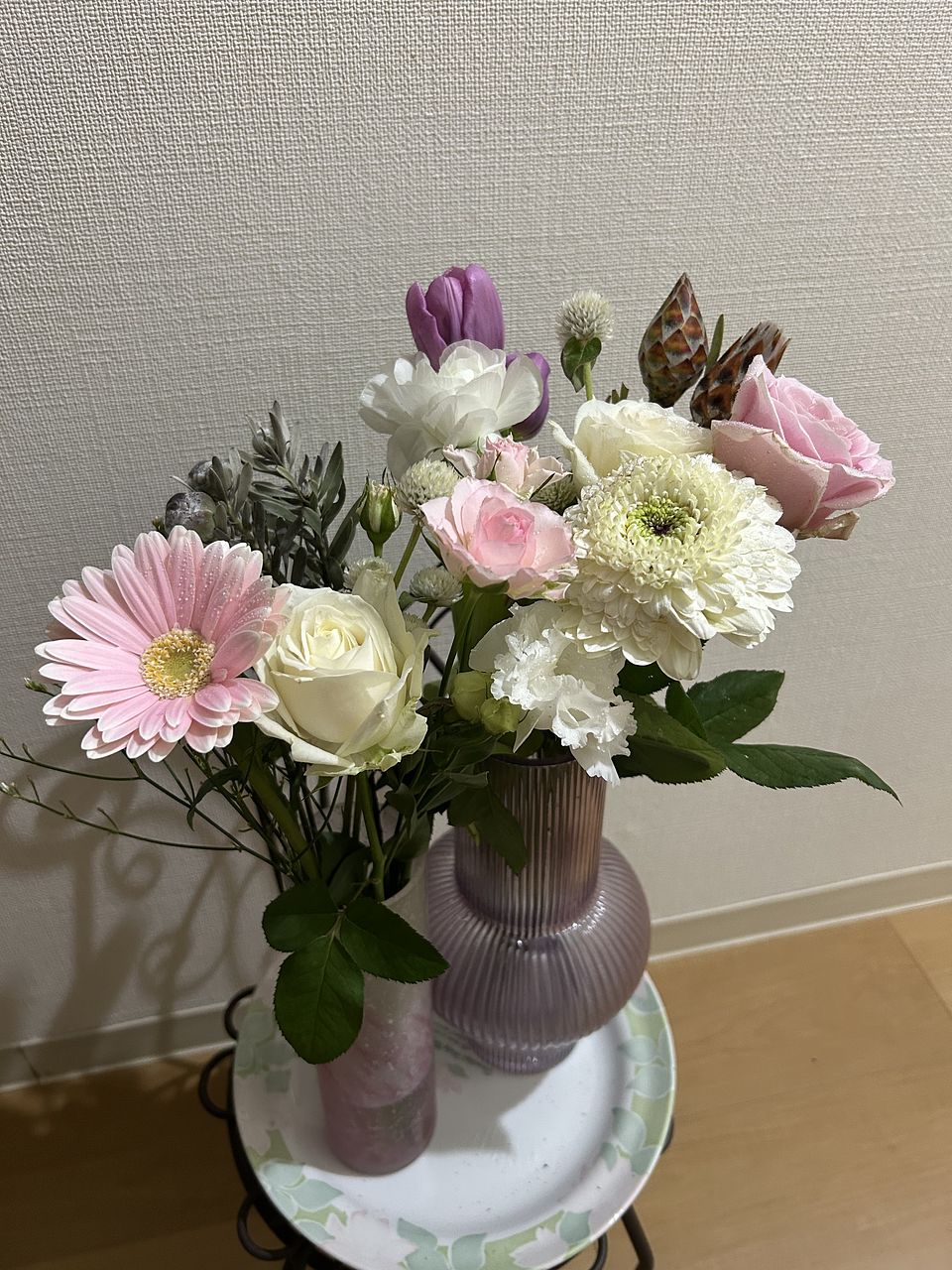 ブーケとあったのでそのまま飾れるのかと思ったのですが、色々なお花が混ざり込んでいたのでいくつかの花瓶に分けて飾ってみました。 お得感満載です🉐