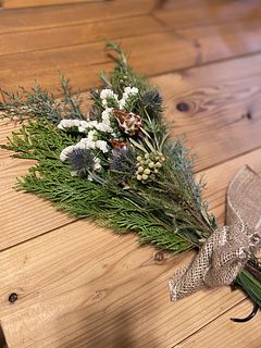 ブルーアイスやにおいひばを中心に、ユーカリやエリンジウムなど、清々しいグリーンと凛とした草花を合わせました。まるで森林の中で眠るような安らぎを感じられるスワッグ🛏️💤
