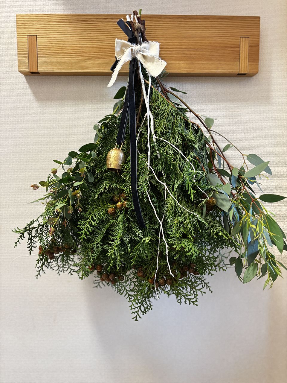 リボンは落ち着いたトーンでまとめ、冬のお部屋にすっと馴染むデザインに。完成後は壁に掛けるだけで、時とともにドライへと姿が変わっていく過程も味わえます。