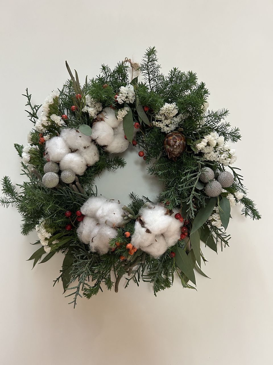 ホワイトコットンが効いていてほっこりとした温かみのあるリースができました 作り方動画もあるので助かります クリスマスが待ち遠しくなるリースです