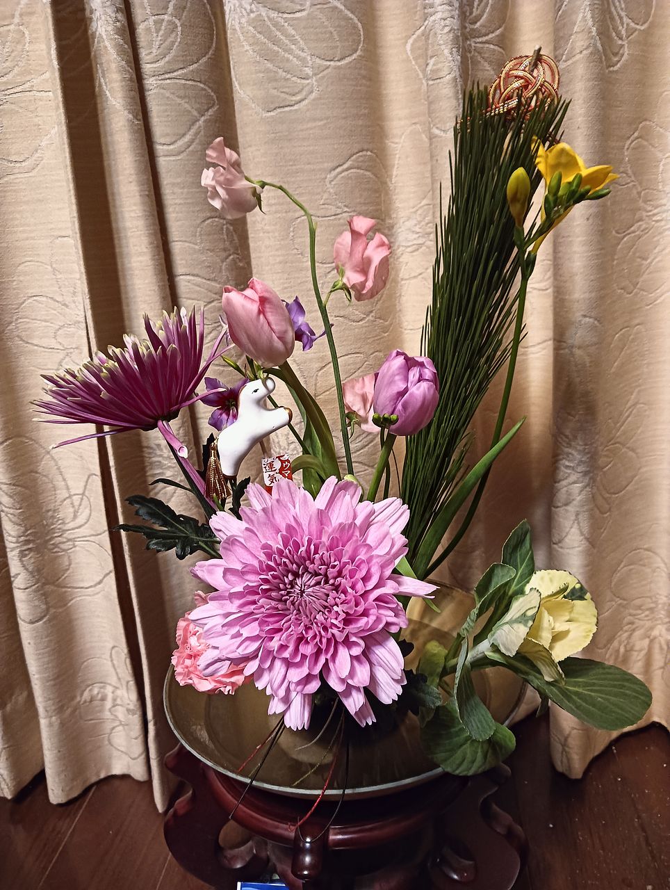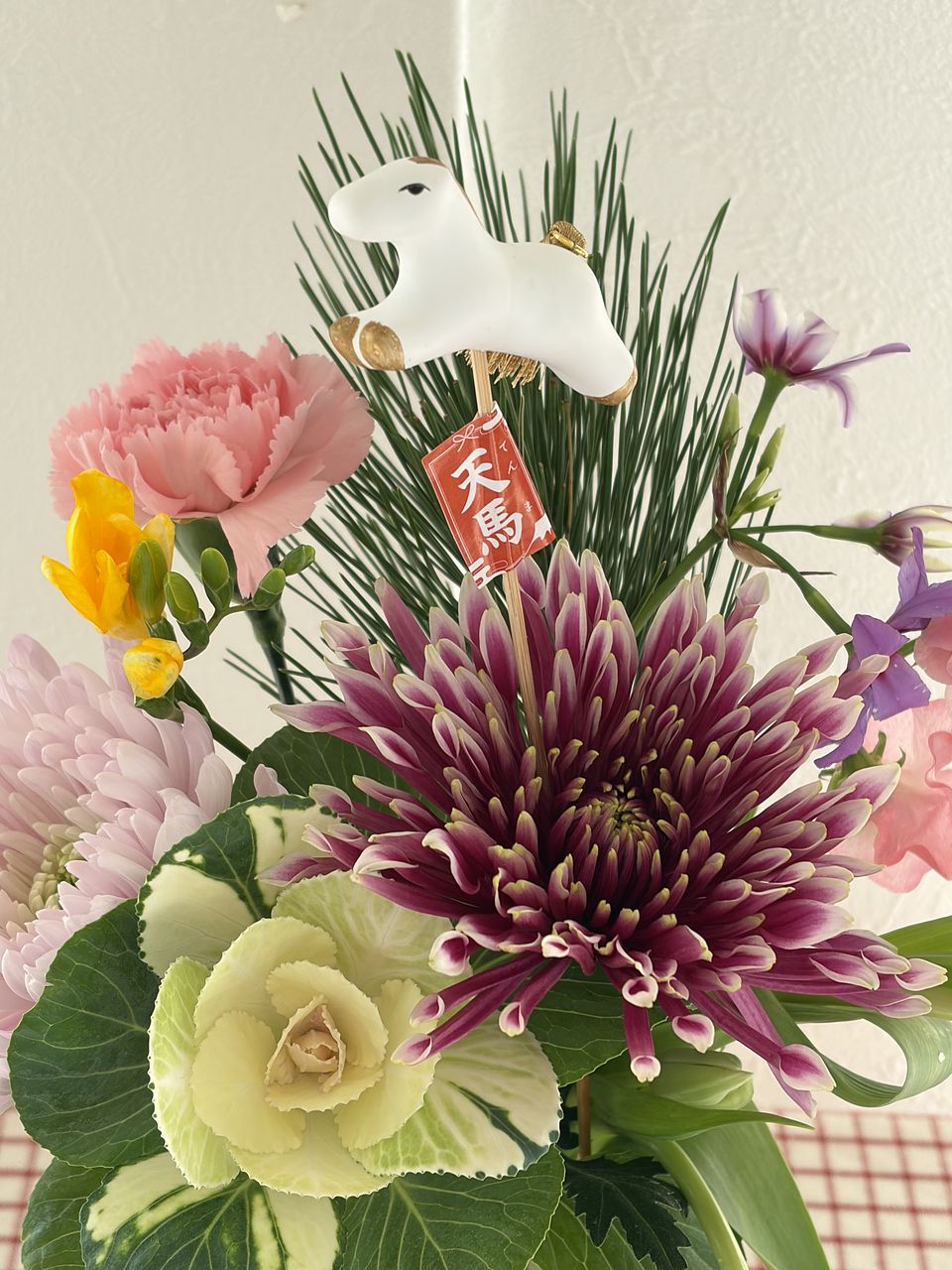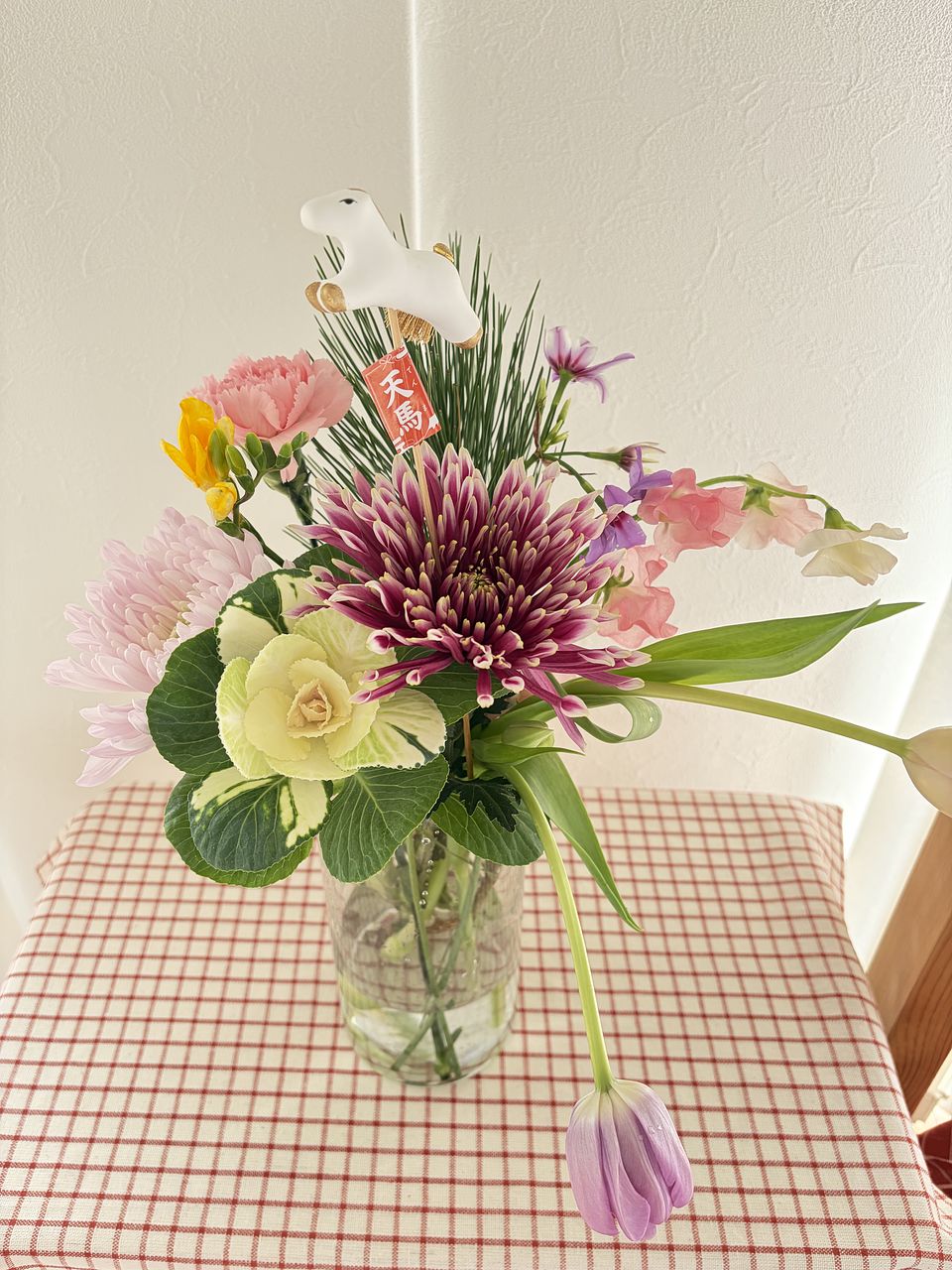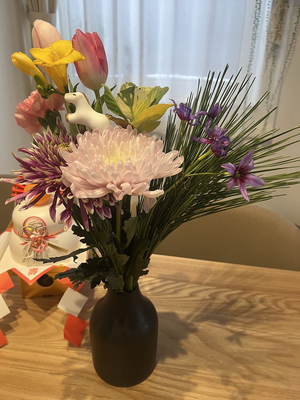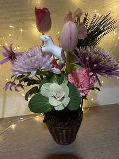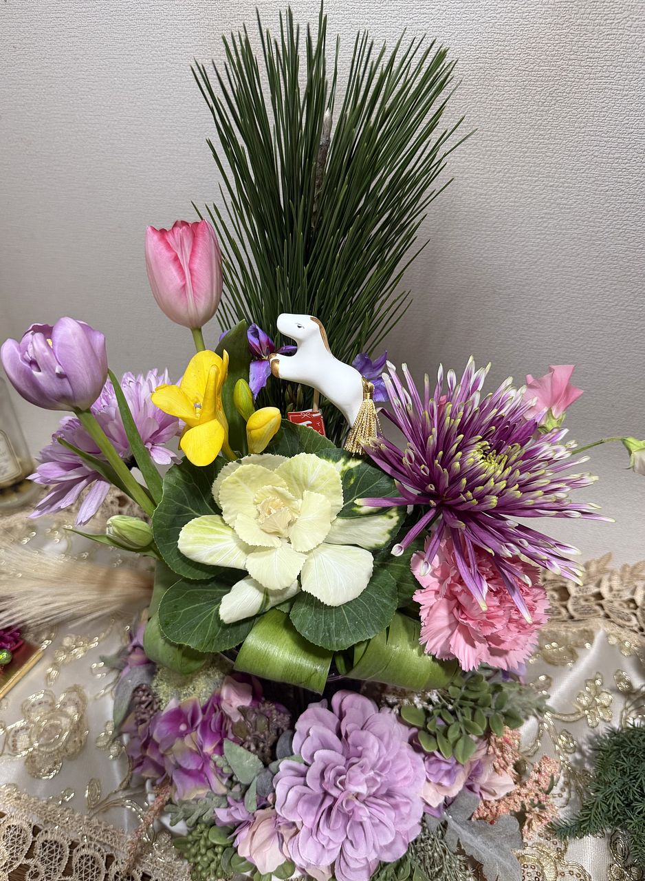 一般的な組み合わせではなく、華やかなマムとチューリップ、フリージアなどで素敵です。馬さんがお正月感を出してくれて良いです♪