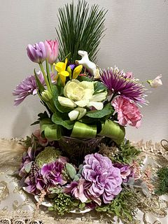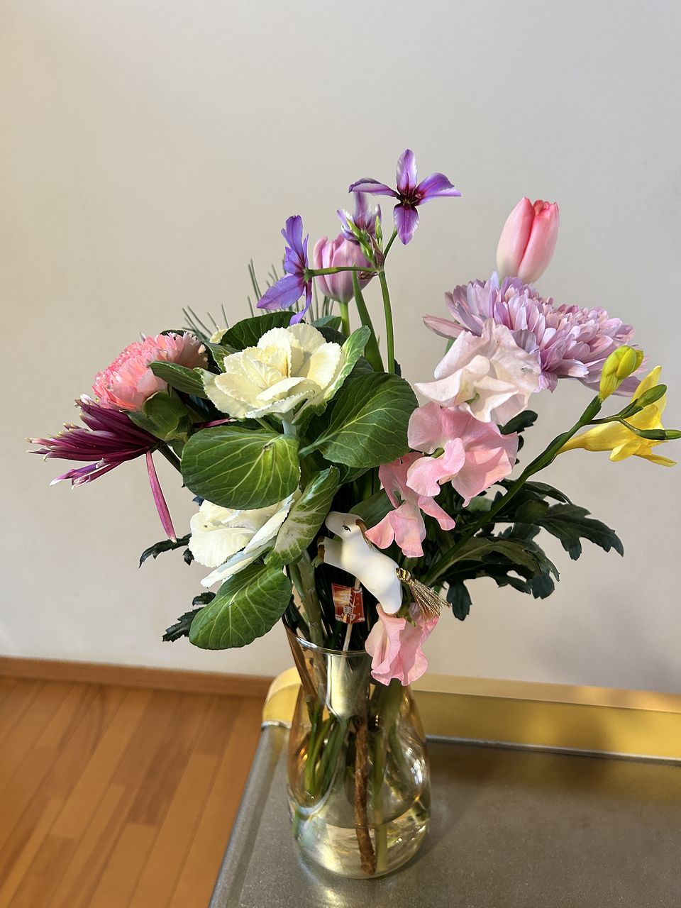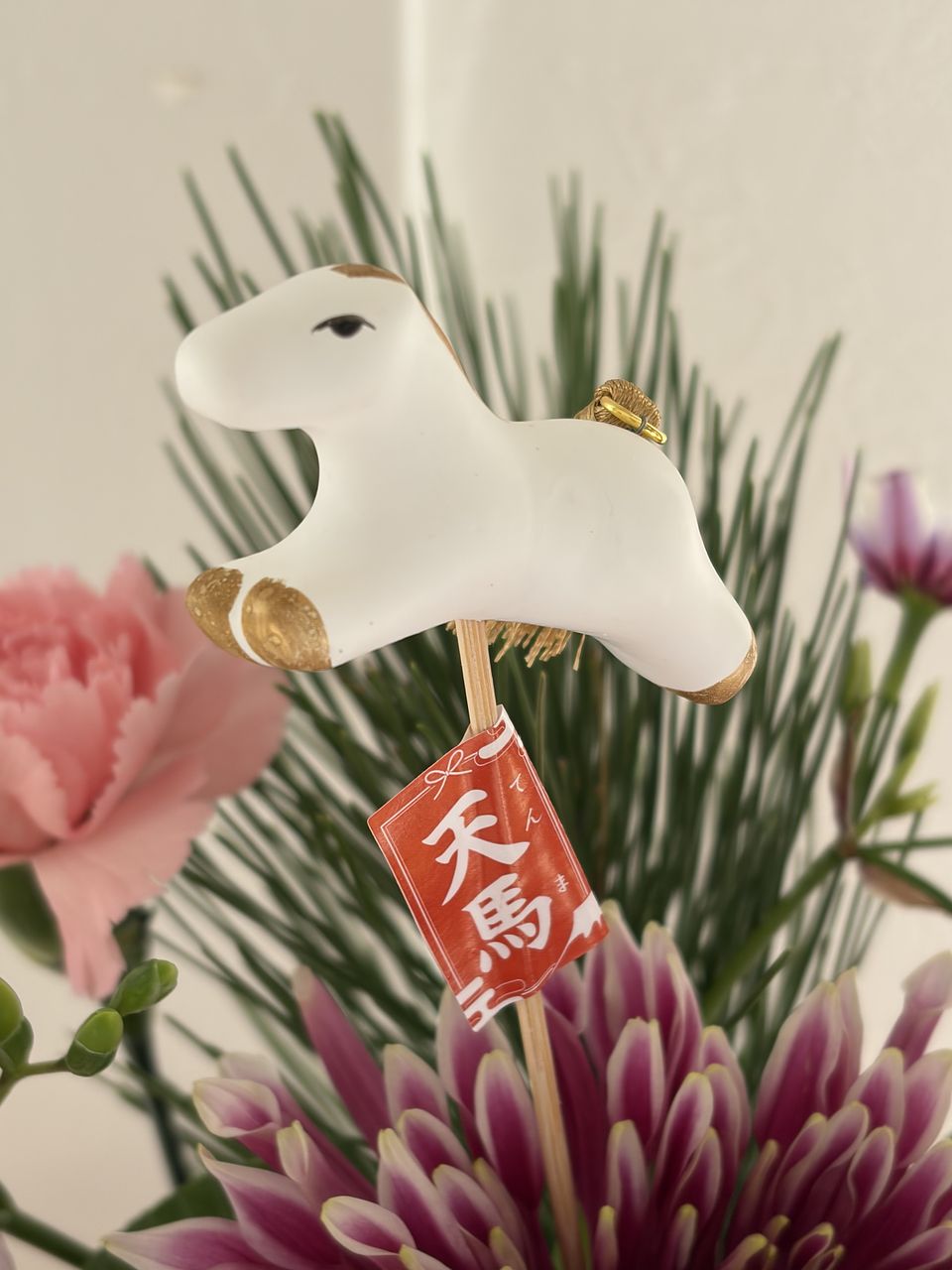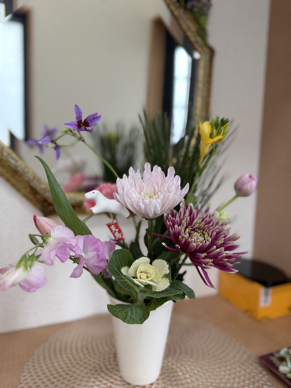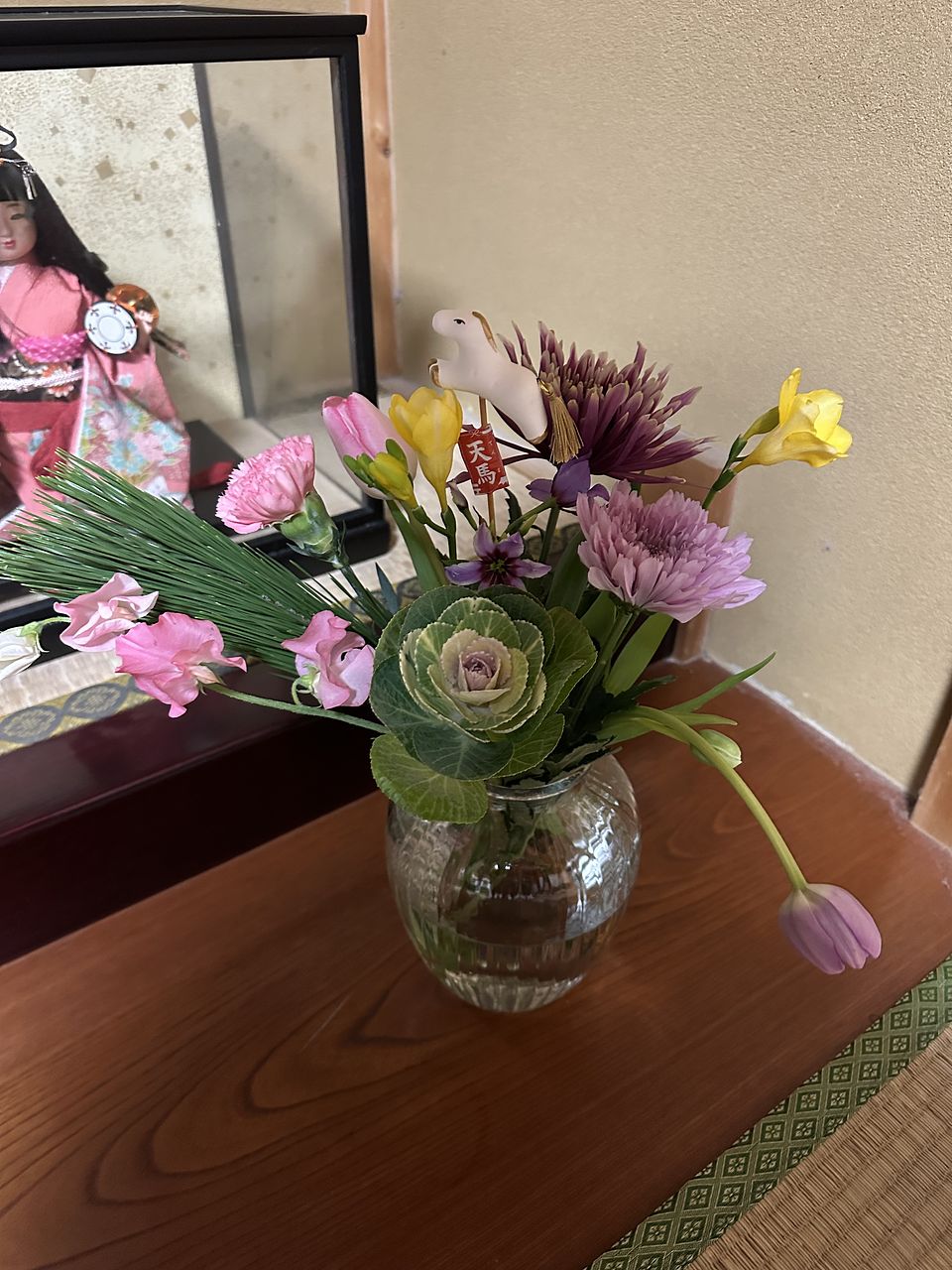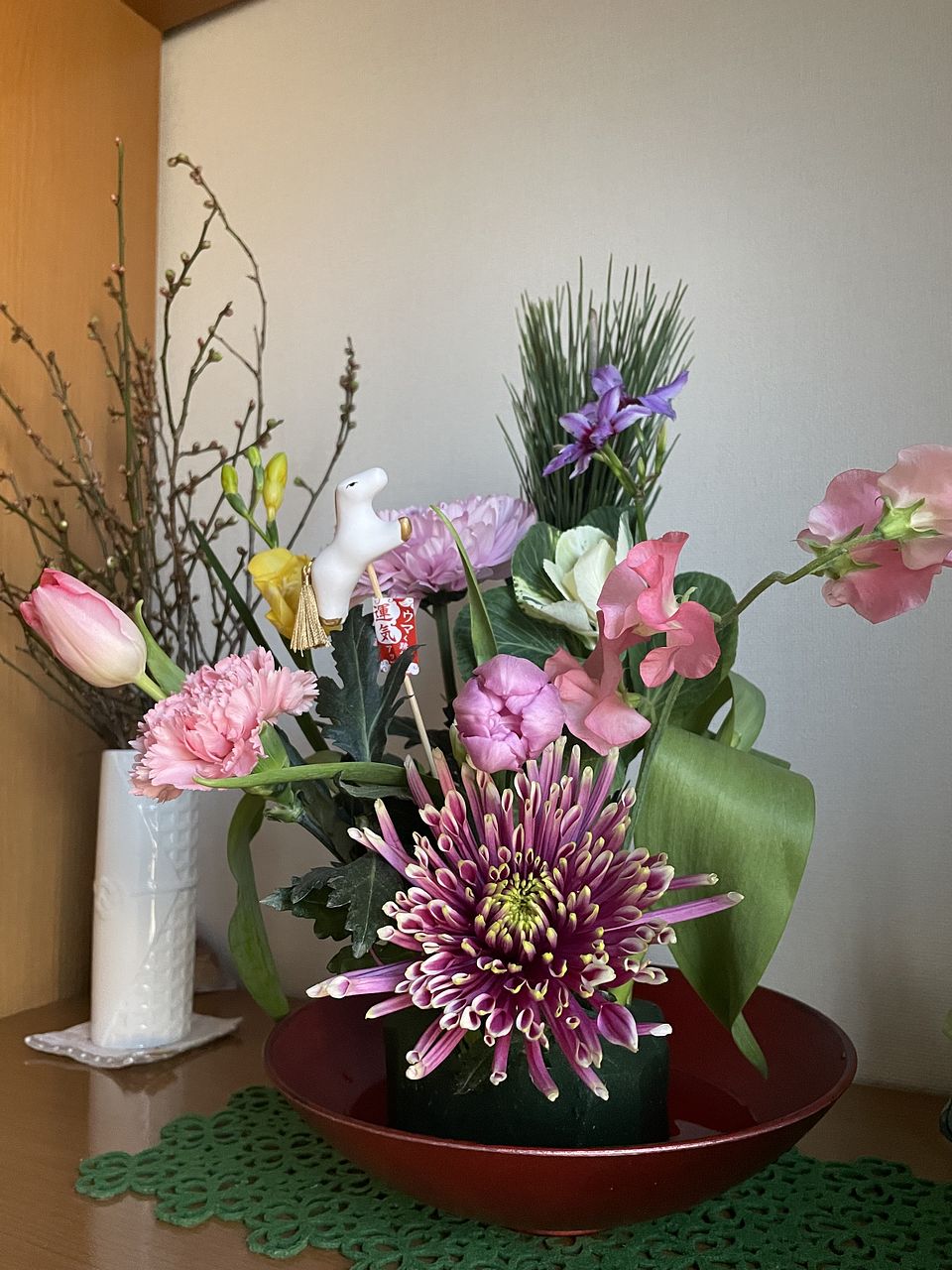 一般的な組み合わせではなく、華やかなマムとチューリップ、フリージアなどで素敵です。馬さんがお正月感を出してくれて良いです♪