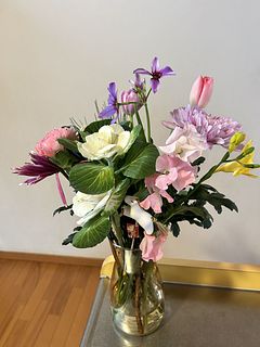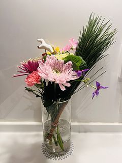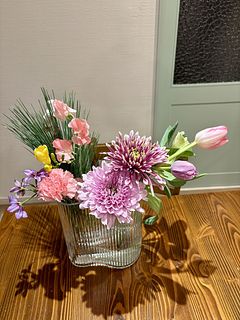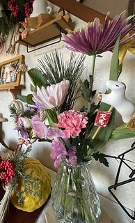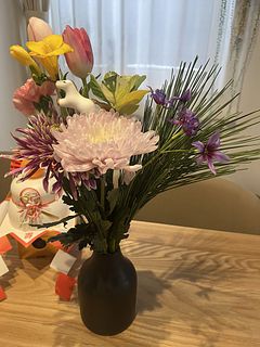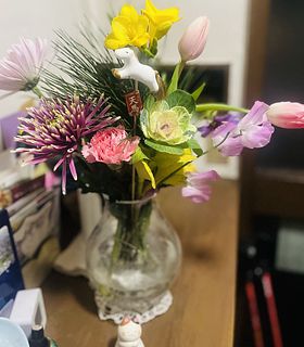 まず、馬のピックが可愛い!それだけでもお正月のお花として気分が上がります。大輪の菊、香りのよい黄色のフリージア、ピンクのスイートピー、チューリップは2本も!この価格でこんなに素敵な花が届いてびっくりです。近所の花屋さんだと、菊が多すぎて和風すぎ、こじゃれたアレンジメントは花が少なく値段が高い、満足して買ってはいませんでした。だから、好きな時にWEBで選んで、家に届く、また利用します♡
