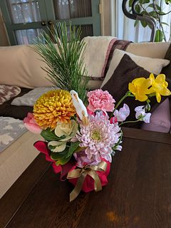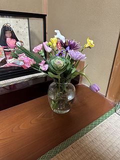 初めても注文です。春らしい色合いで素敵でした。馬のピックもとっても可愛い。もっと華やかにしたかったので手作りのリースを下に置いて一緒に飾ってみました。