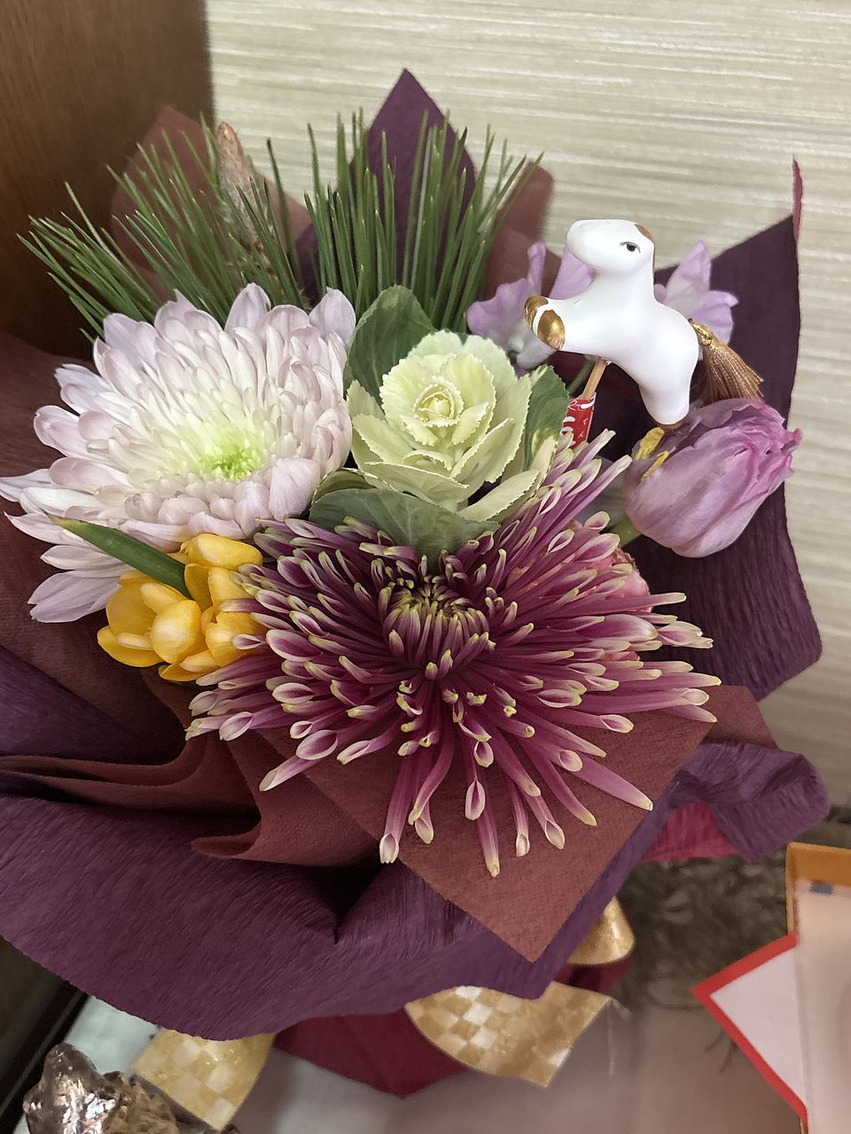 お正月らしい素敵なブーケでした💓 菊と松がいい感じで、大好きなチューリップも入っていたので嬉しかったです🥰 馬のピックもアクセントになってて👍