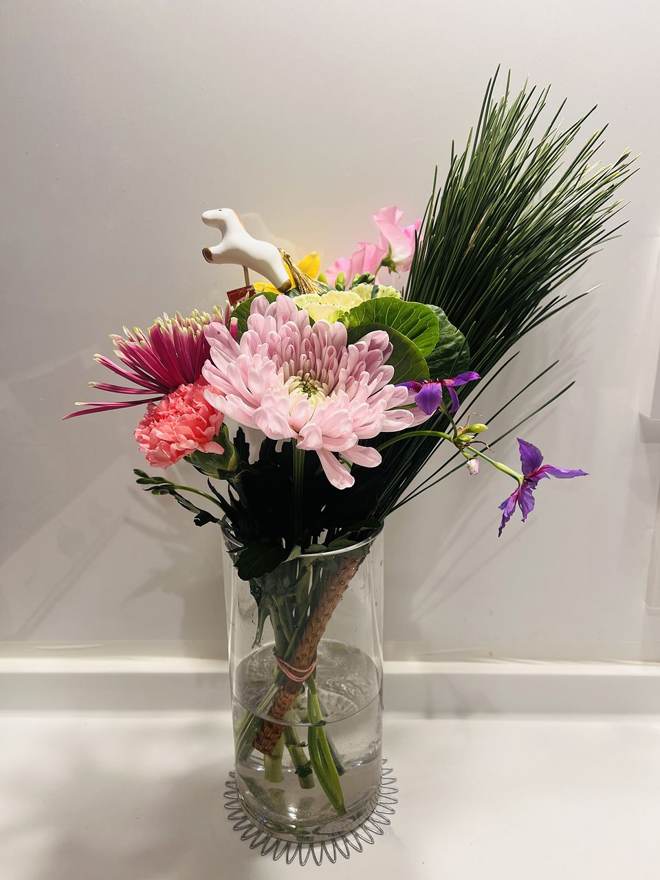 年女なので、馬のピックが付属しているこのブーケを選びました。とっても可愛いです。 お正月らしい華やかなブーケでとても気分が上がりました。 チューリップは別の花瓶に入れて飾りました。