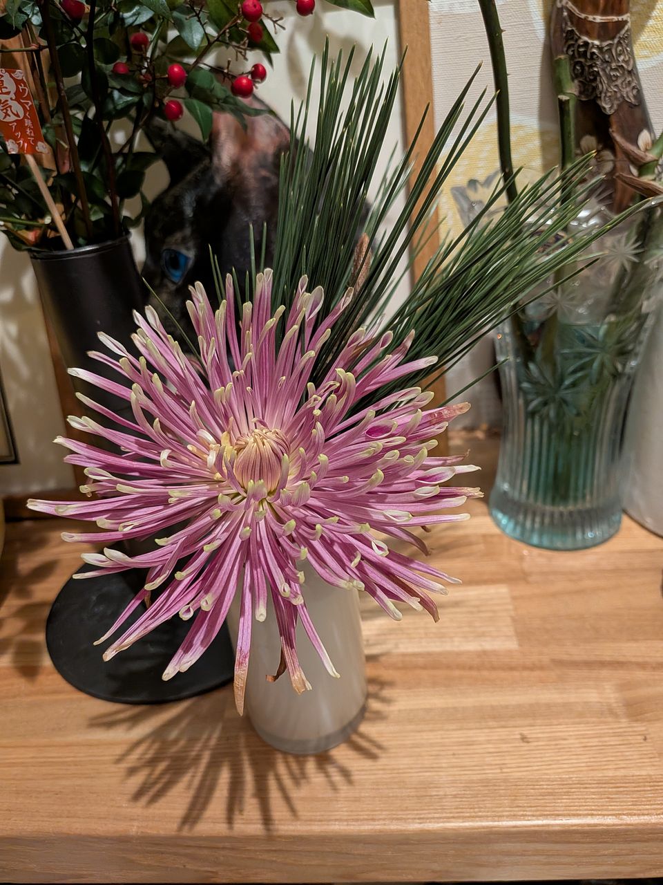 菊が立派で松とピックがお正月のムードでした そのまま花瓶だとまとまりづらく オアシスを購入してきて花器も風呂敷で包んでみました 一気にお正月っぽいアレンジになりました