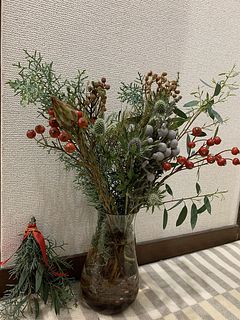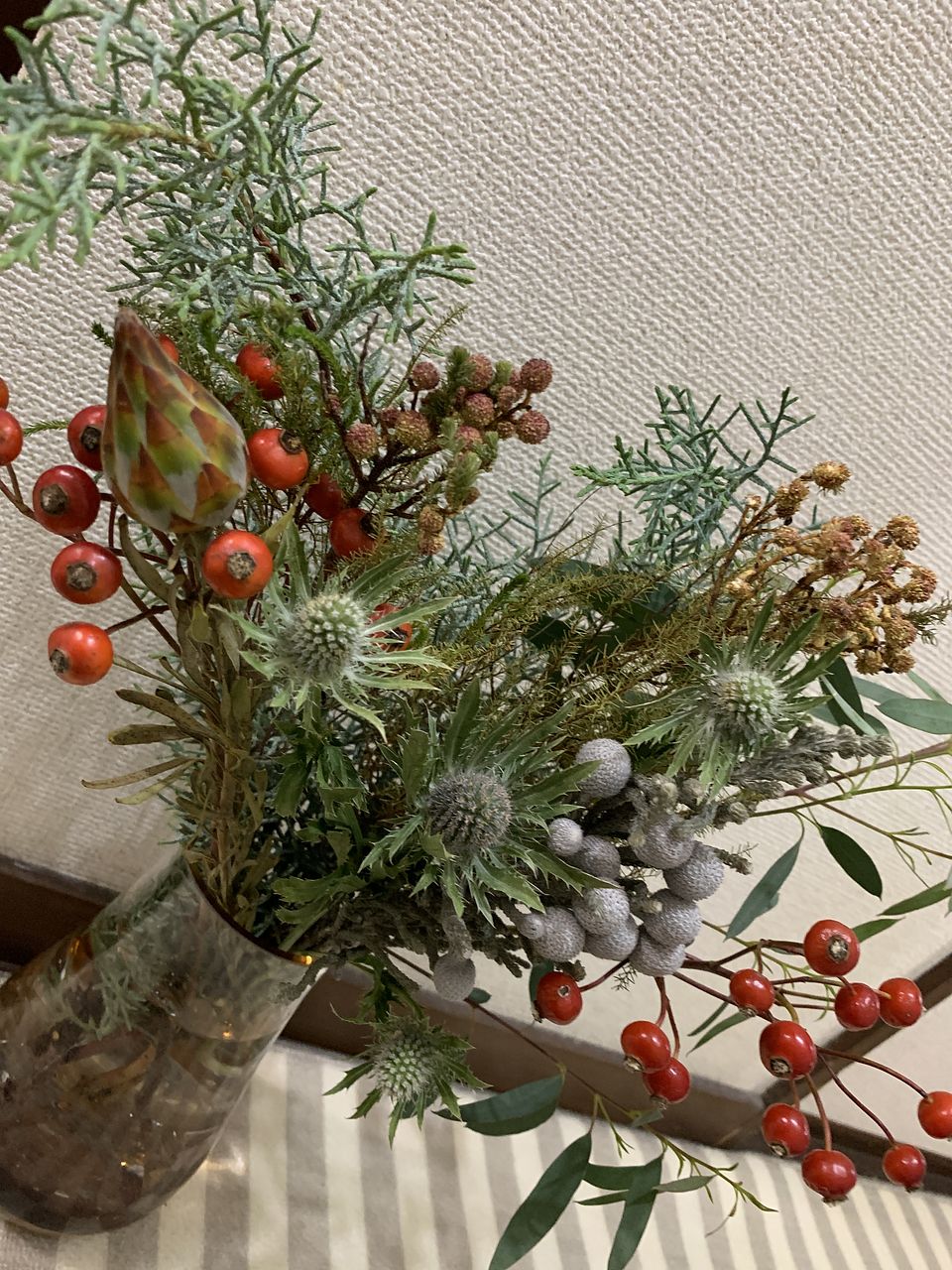 ルビーのようなバラの実がクリスマスらしいポイントに。そのまま吊るしてスワッグにもぴったり。クリスマス気分を長く楽しめます🎄