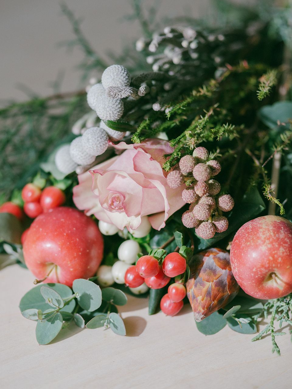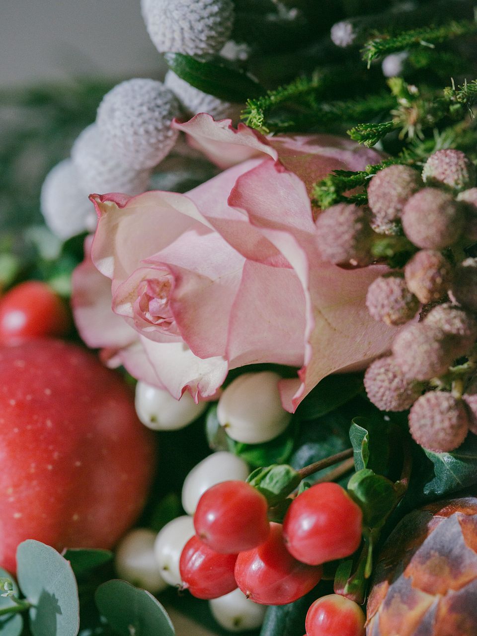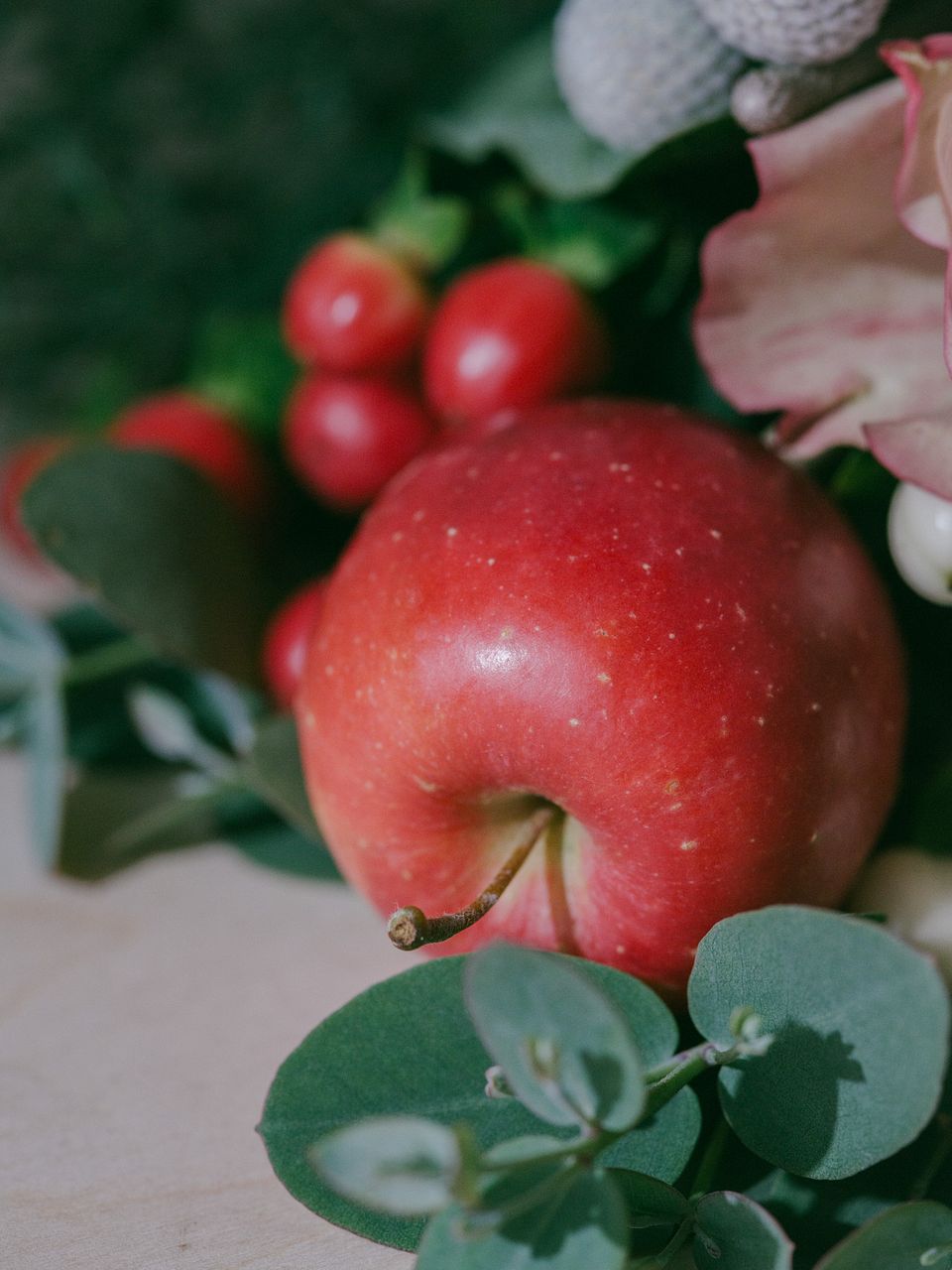 つやっとしたりんごに、赤や白の実ものがツリーのオーナメントのようなスワッグはいかが?