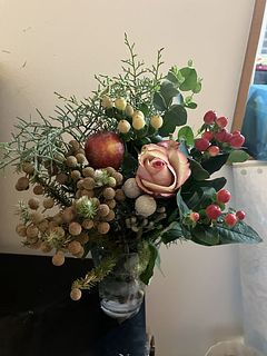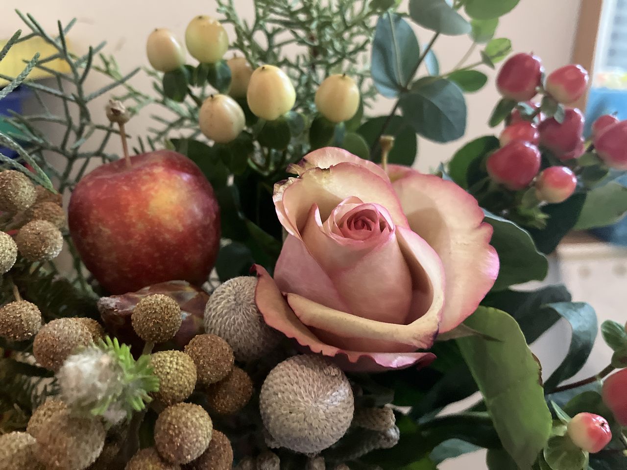 バラ / ヒペリカム / バーゼリア / リンゴ / リューカデンドロン / ユーカリ / ブルーアイス など(一部サブ花材の変更がある可能性も)