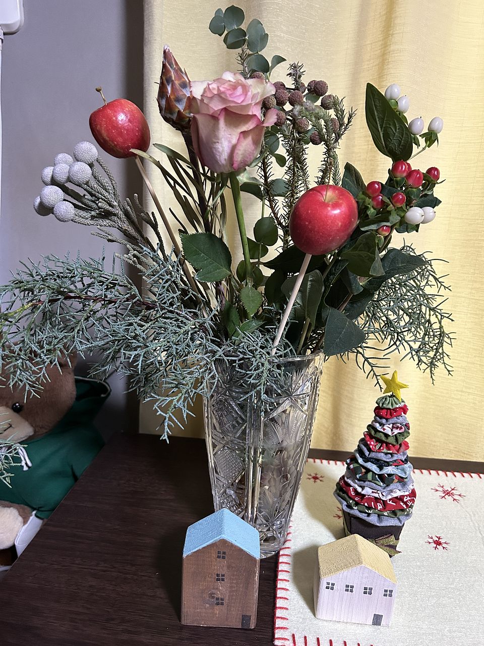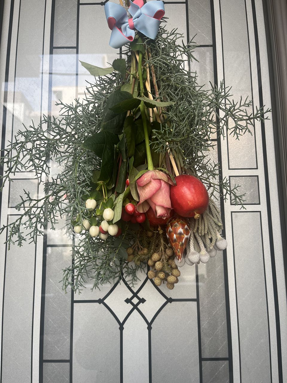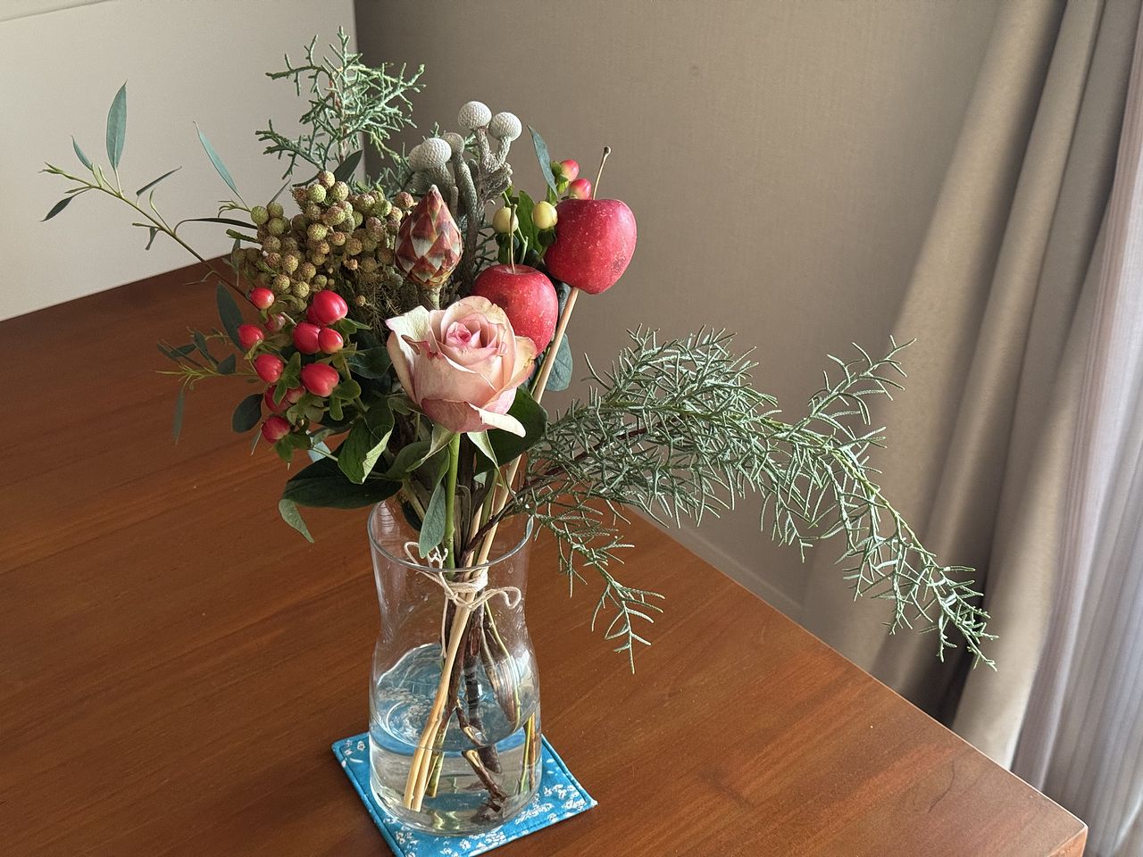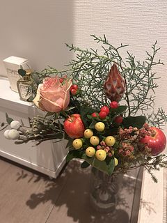 お花が大好きで、以前にアレンジメントを勉強していたので、ステキなお花やアレンジに興味があり、クリスマスも近いのでスワッグを初めて注文しました。色つかいやお花やグリーンの新鮮さがとても気に入りました!1輪のバラとリンゴがいい感じです。またお願いしたいです。