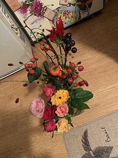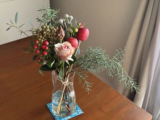 お花の組み合わせのセンスとコスパが良かったので初めて購入しました!! 新鮮でボリュームがあり、とっても満足です(*ˊ˘ˋ*)。♪:*° 赤いりんごがアクセントになっていて可愛かった♡ アンティーク調のバラは別で楽しんでます。