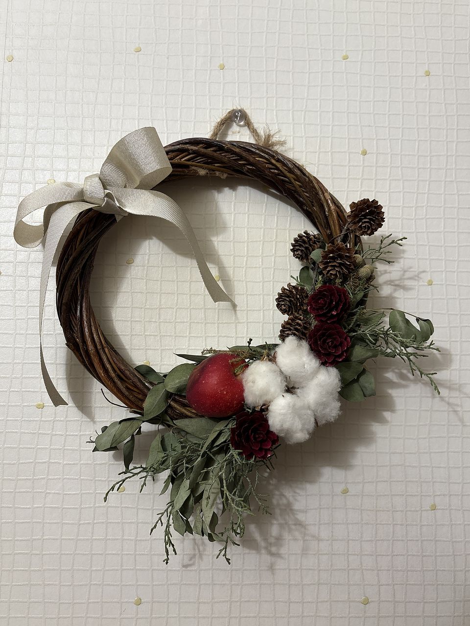 りんご🍎が可愛いスワッグです。 ボリュームもたっぷりで,バラの色が渋くて素敵でした。お値段もリーズナブルでした。