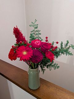 旬のバラやマム、カーネーションをを贅沢に束ねました。一輪一輪咲き方や色が異なり、幾重にも重なる花びらが美しい🥰