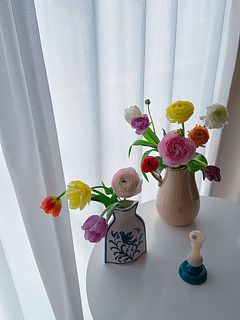 春らしいカラフルな色合いで、寒い日々でも心が温まるようです。チューリップとラナンキュラスの春の花で空間の彩りとして非常に満足しています