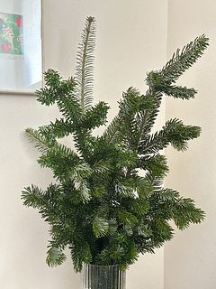フレッシュなモミの木の枝が届きました。1本は木の上の部分?のためか、葉が少なくさびしい感じでしたが、3本束ねるととてもボリュームがありステキです。とりあえず20cmの花器に入れてみました。大きさもちょうど良く、オーナメントを飾りクリスマスツリーとして楽しもうと思います。