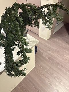 枝も葉もしっとりと湿らせてくれていたので新鮮な状態で届きました🎄 枝が前のめりに湾曲してしまっていて、花瓶に生けても前に倒れてきてしまい、苦戦しましたが麻紐で後ろへ引っ張りなんとか立てることができました😅 花瓶の口は小さめ、底が大きめの花瓶の方が安定するのかな? 思った以上に葉が抜けてしまっていて、勿体無いので集めてピンに入れて飾ります🎄