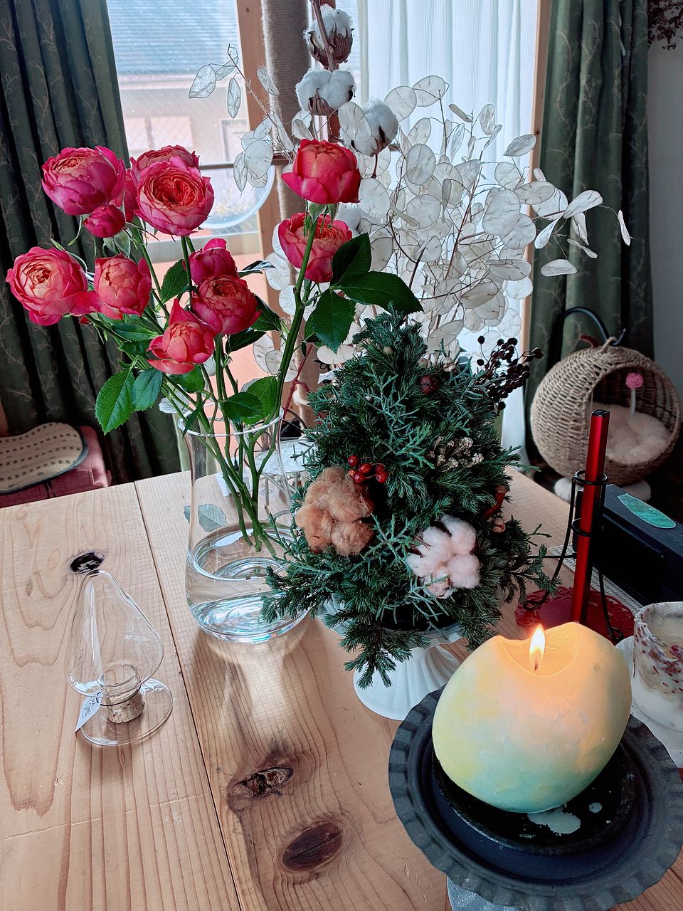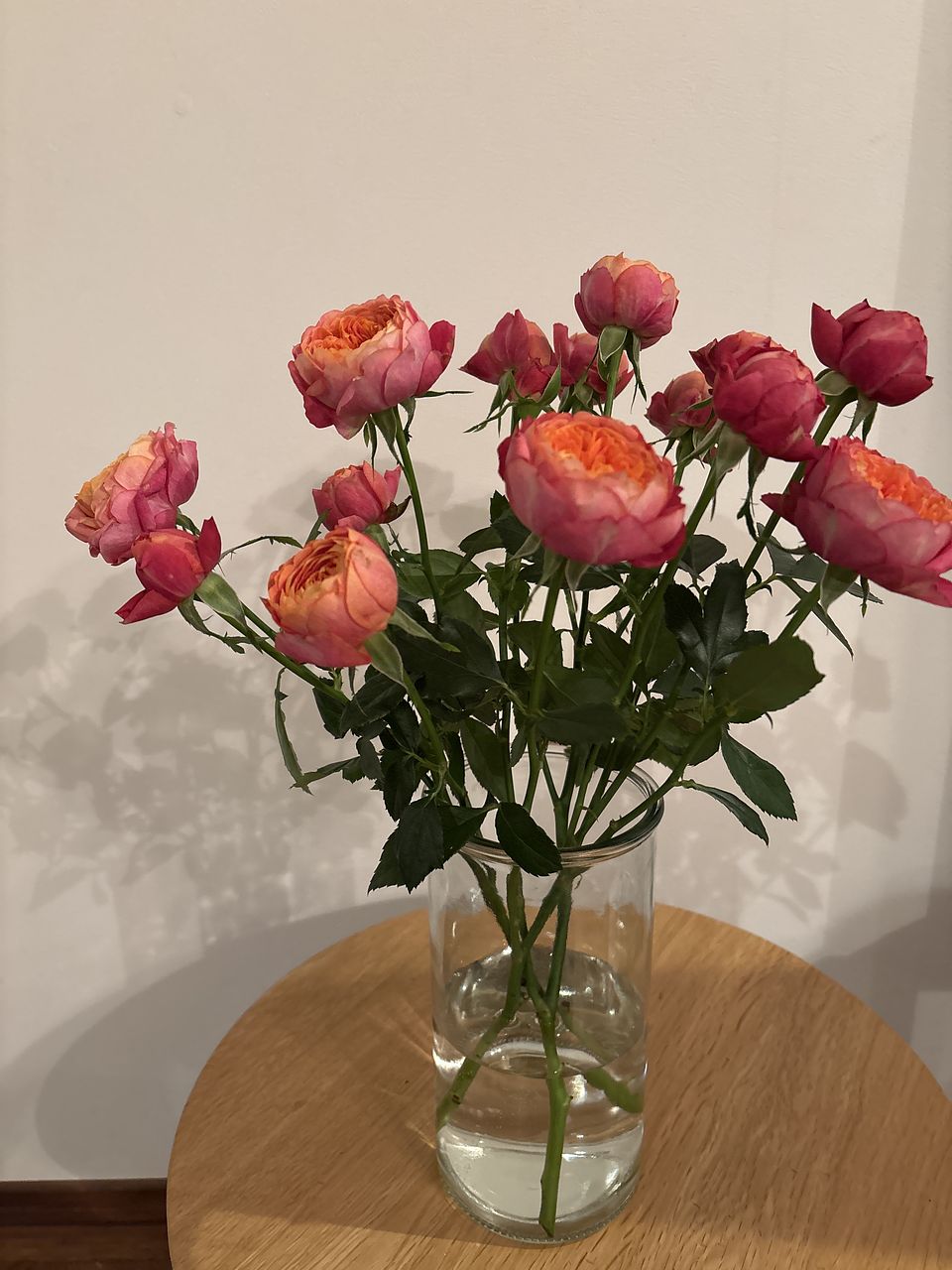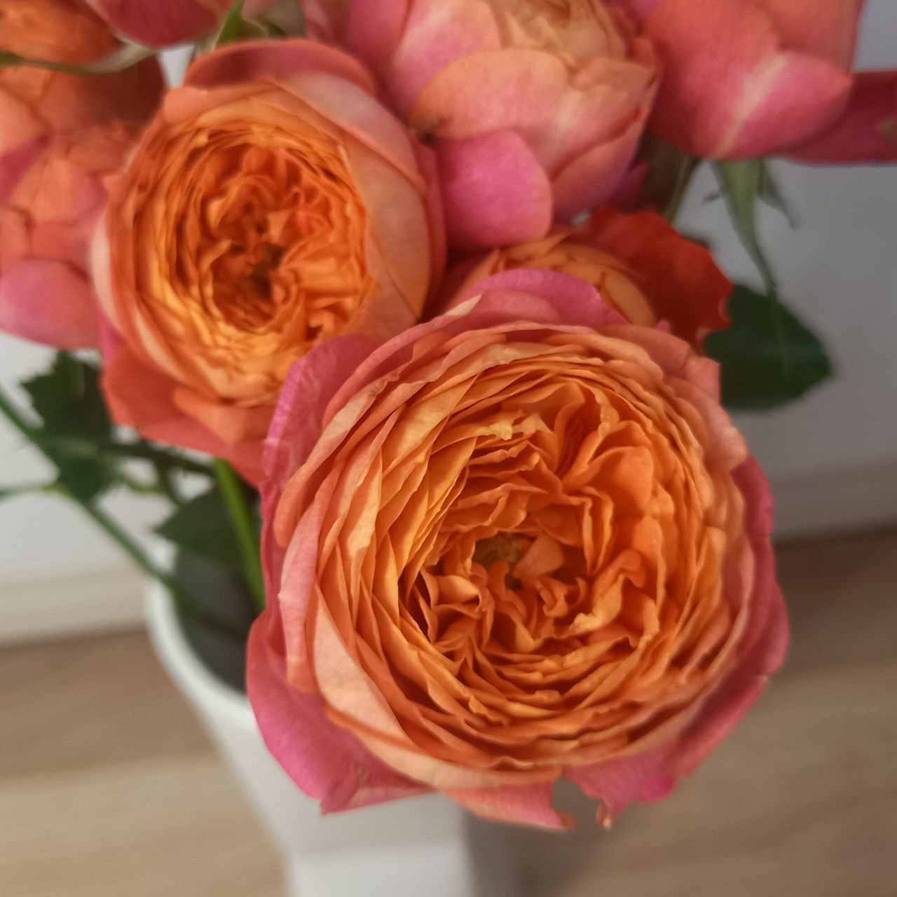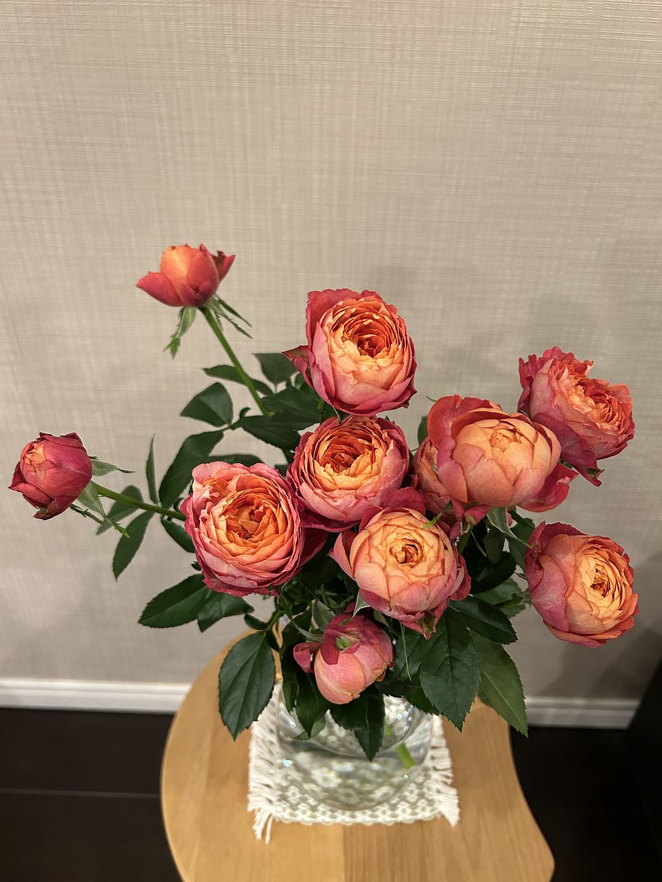 なんとも言えないオレンジと赤のうつくしいお色。愛らしくて、それでいて、こんなに大きいのに、スプレーバラなんて、見事です。希少な薔薇を拝見できて、食卓にかざらせていただきました。