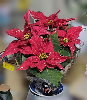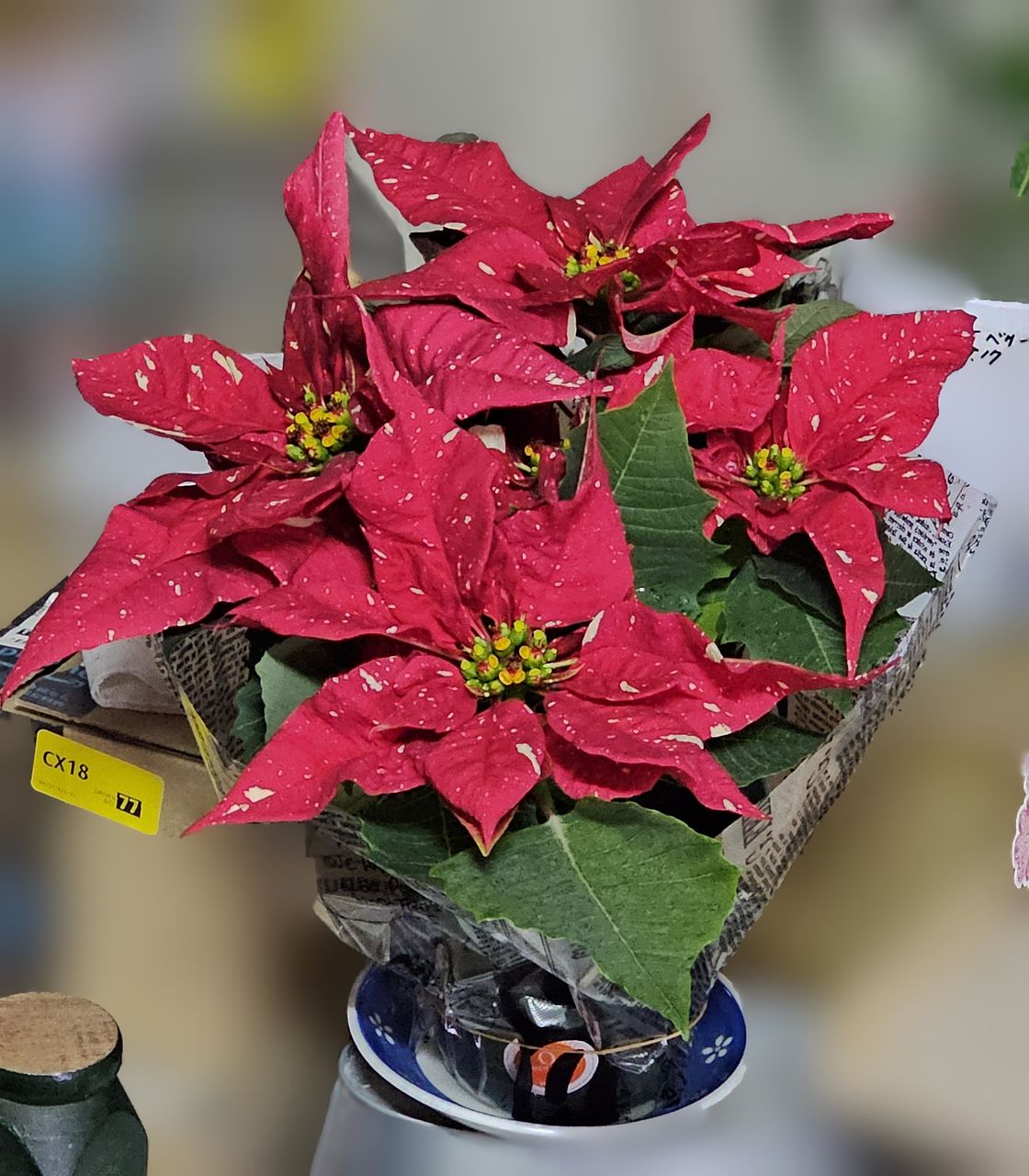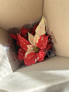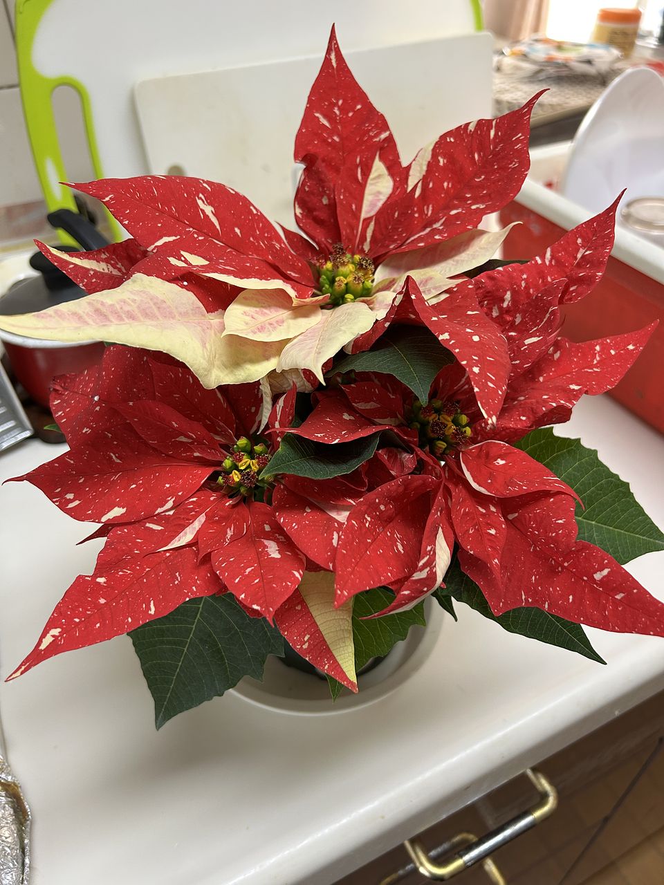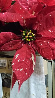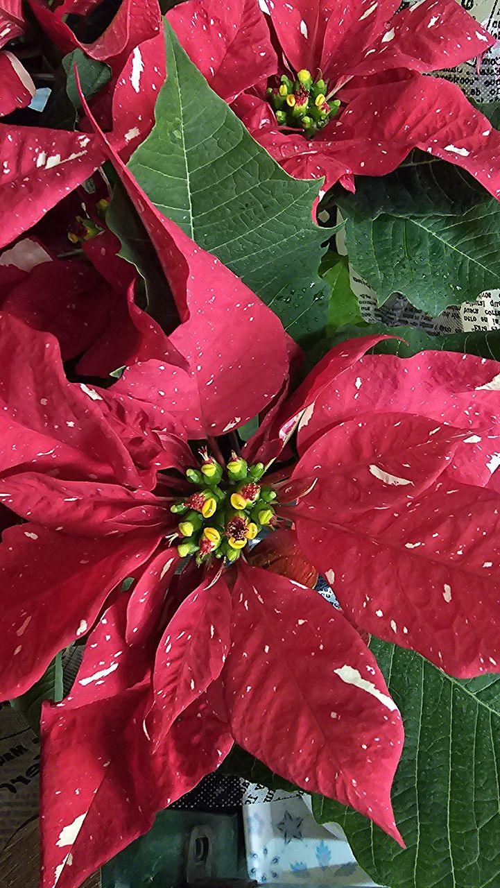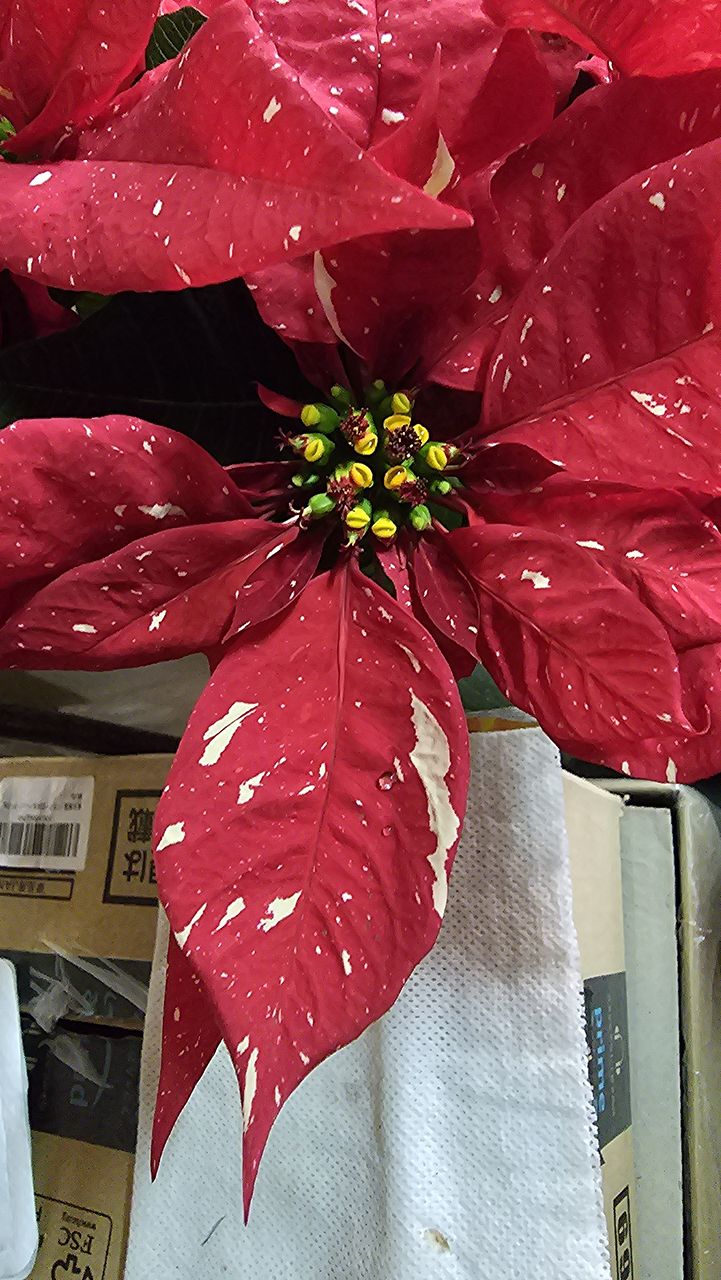 葉の色とポインセチアの苞の赤に まるで雪の様に散りばめられたアイボリーの色のコントラストが、凄く綺麗です。鉢の底からポインセチアの苞の先(一番高い)まて、約31cm、横幅(ポインセチアの苞の先から、先まで)は、約35cmもあります。凄く、綺麗です。