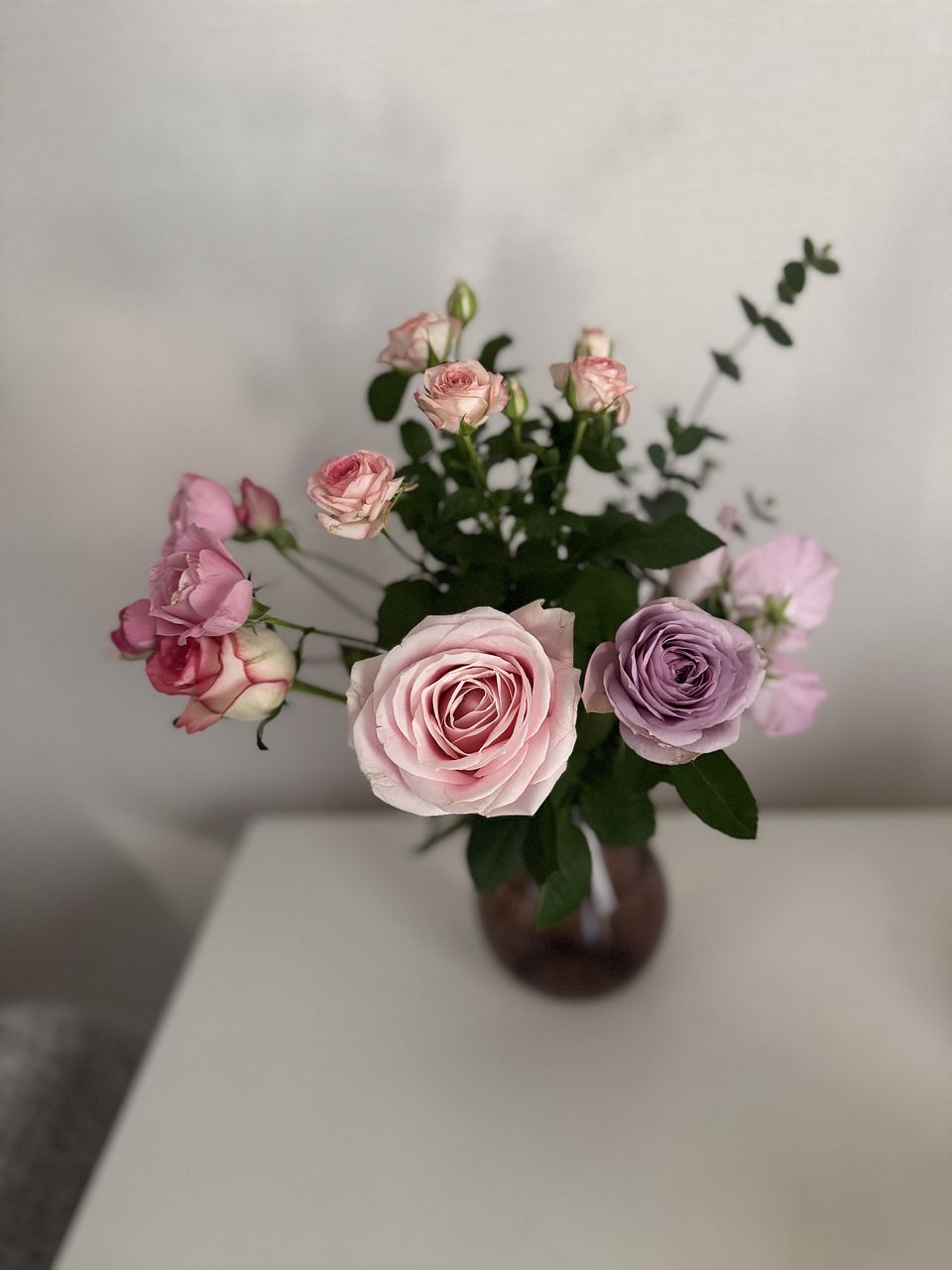 はじめて購入しました。届いて箱を開けると薔薇の良い香りがして、主にピンク色のバラ達が。一本薄い紫の薔薇もあり素敵でした。水に使ってしまう部分の葉っぱを取る作業をする作業も良いなぁと思いましたました。バタバタ忙しい毎日でしたが、花を楽しむホッとする時間ができました。これからも花や葉に触れて花を見てくつろぐ時間を楽しみたいです。Flowerさんありがとう😊