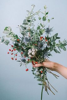 エリンジウムや針葉樹のブルーアイス、バラの実を組み合わせて。ドライに向いてるお花をセレクトしています。