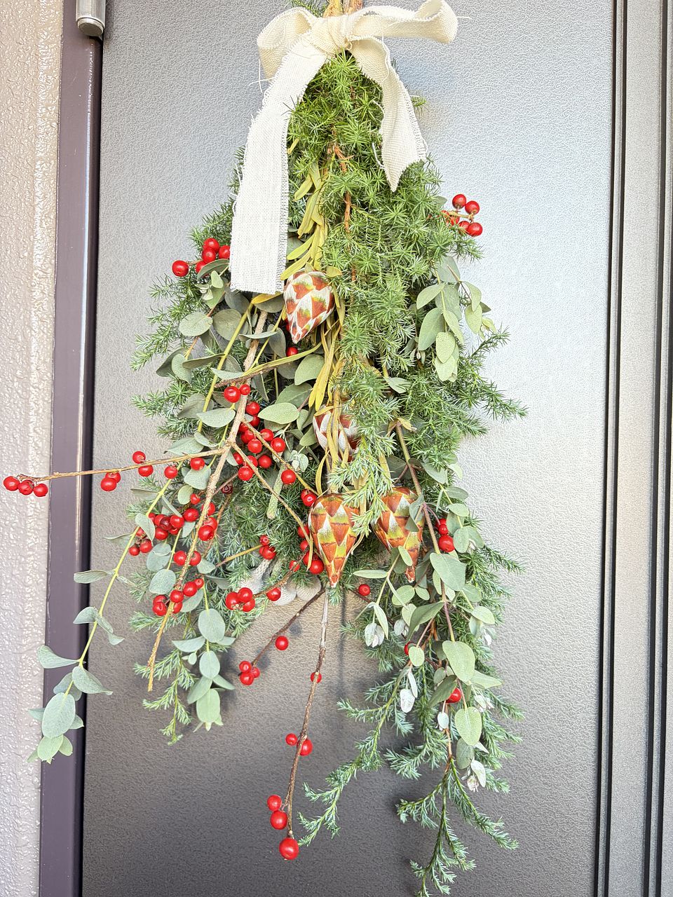 ウインナーベリーがとても映えます。 クリスマスのリボンを結んで、スワッグにして楽しみます♡