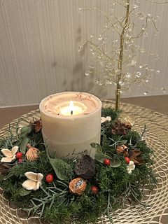 ボリュームたっぷりのスワッグを作っても 花材が余ったので 直径10cmほどのリース台を使って テーブルリースも作りました。 手持ちの木の実をトッピングして キャンドルに火を灯したら 可愛いテーブルリースになりました。