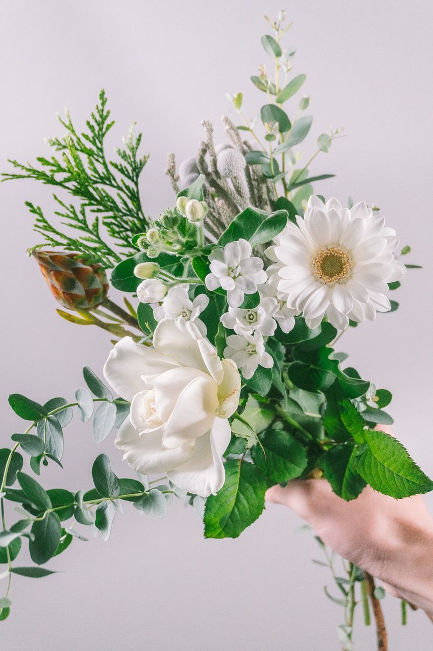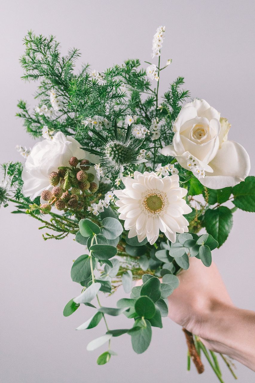 雪が舞う季節にぴったりの、穏やかな雰囲気のブーケ。