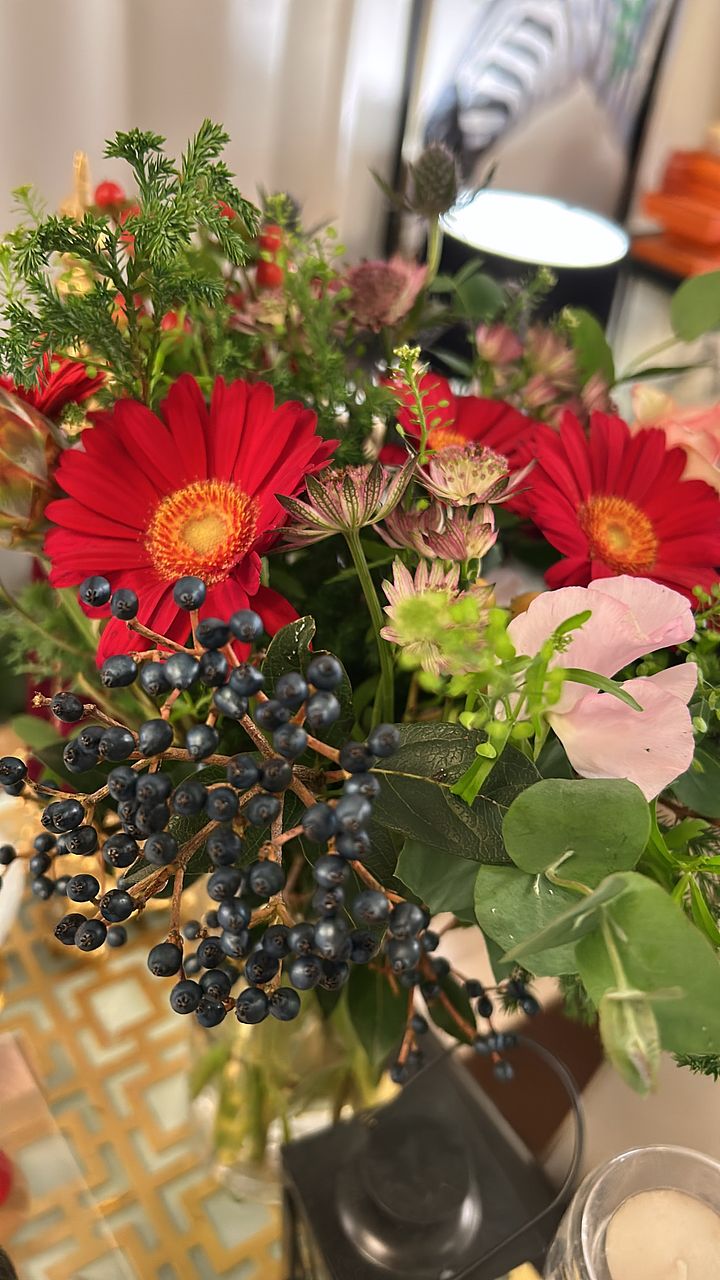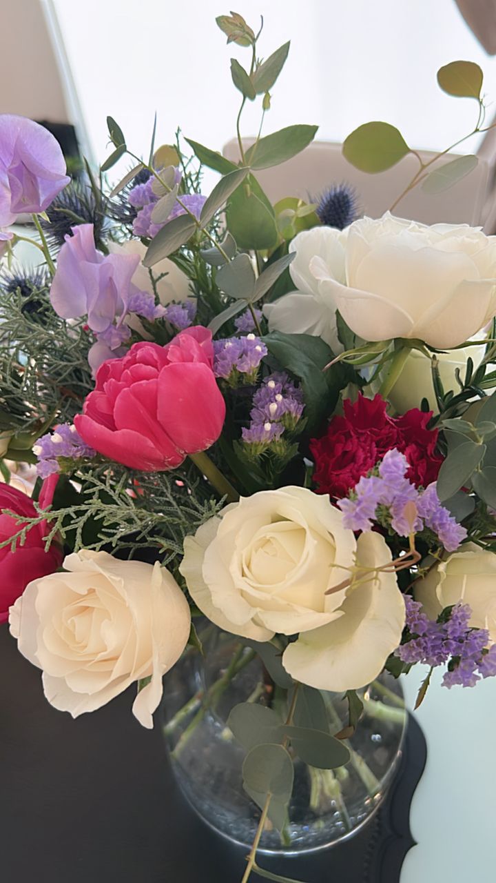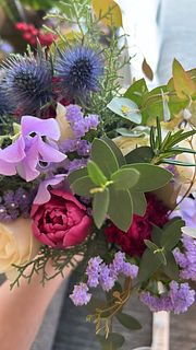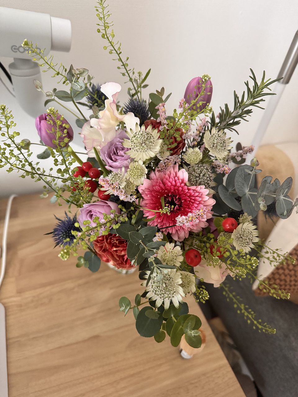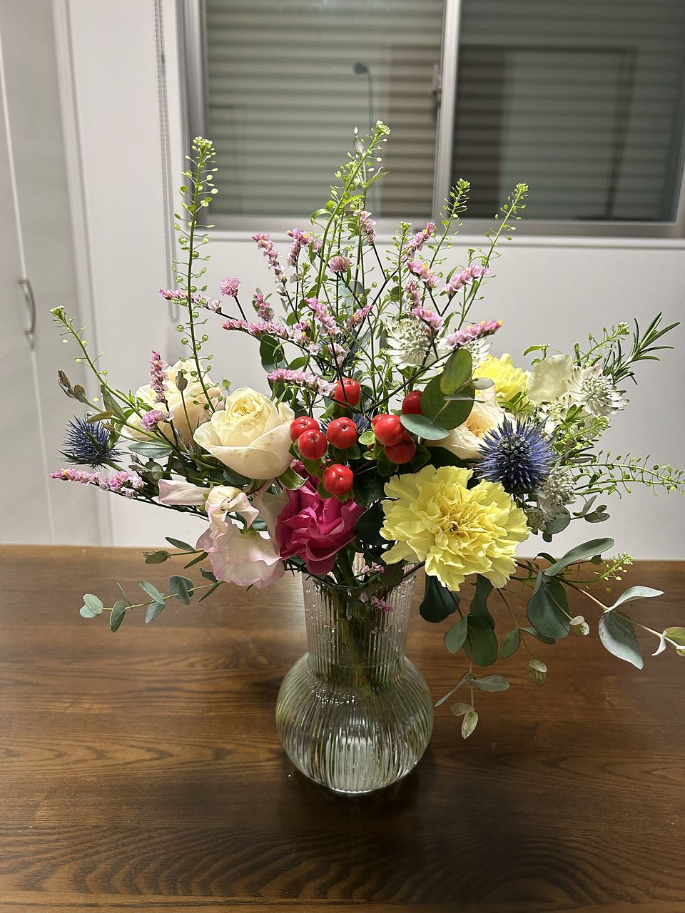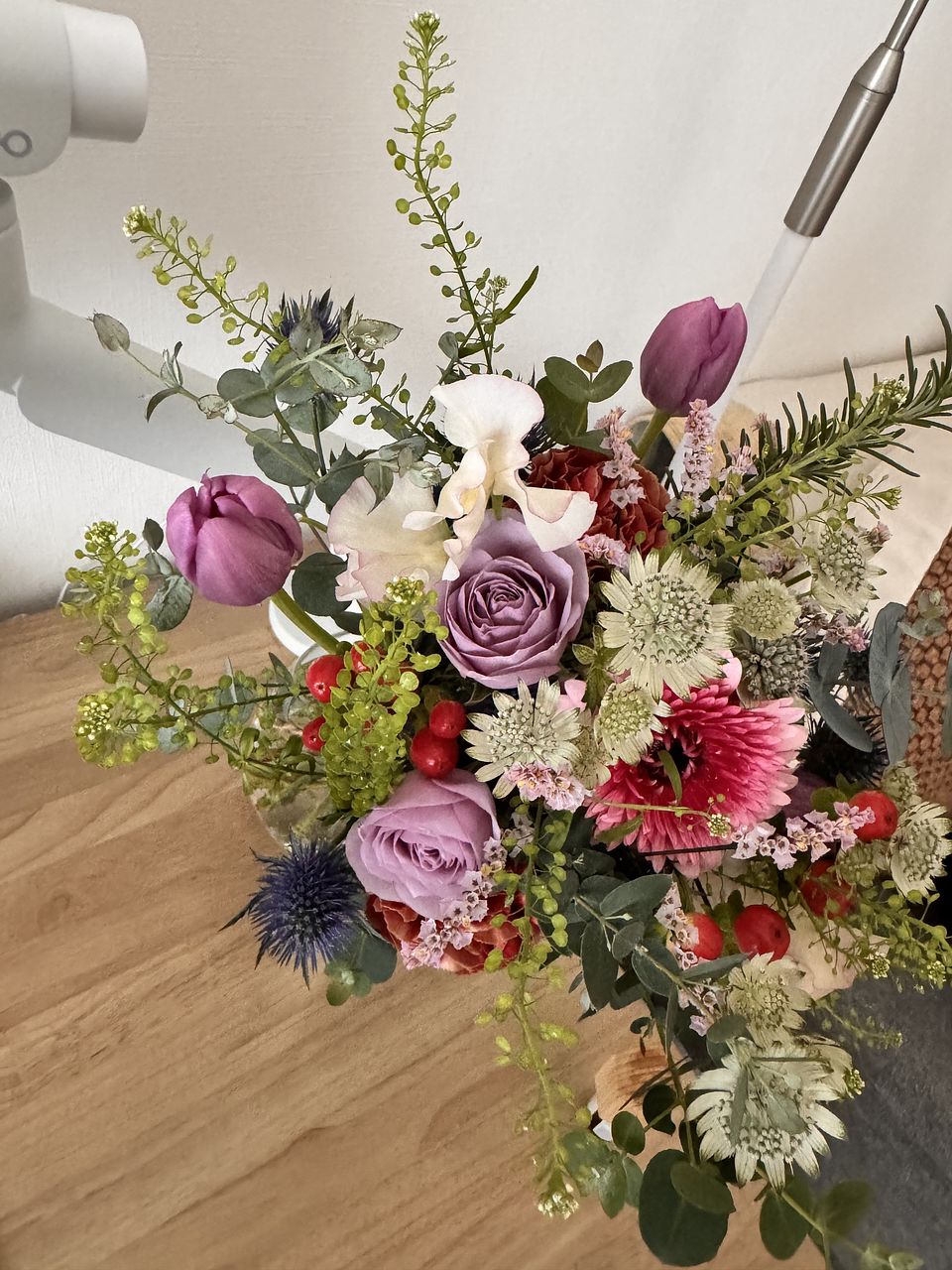 やっと念願のayaさんのブーケを購入でき嬉しい!グリーンの使い方がとても素敵。丸い葉のユーカリなど、普段見る事があまりない花材の組み合わせが素敵。だけど、タイミング的にクールの配送じゃなくなって、心配してたら案の定、まる2日かかりで届いたお花は、小さなお花はパラパラと落ちて、少しカラカラ気味、トルコキキョウや、カーネーション?のピンクのお花は全て薄茶に変色してしまっていました。配送中の、2日間は30度に近い気温だったので、残念でした。なので、こちらの評価になりました。本格的に涼しくなったら、またお願いしたいと思います。