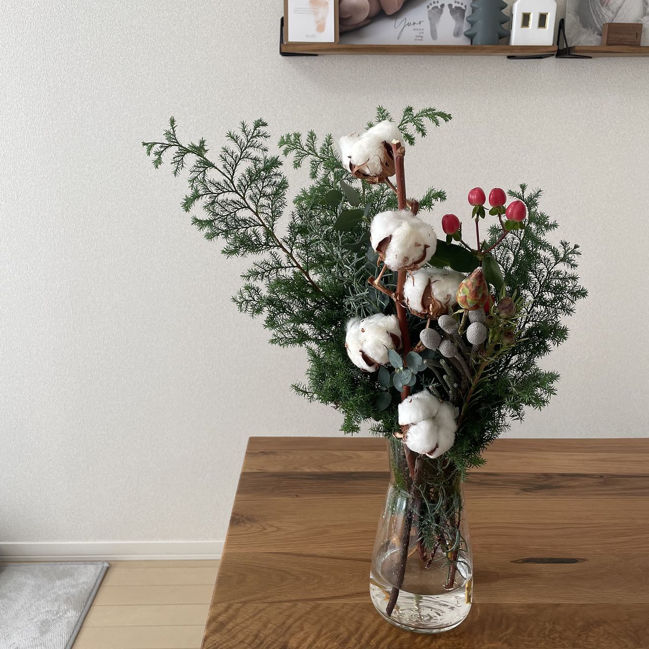 生花と一緒にかわいく花器に飾る目的としてコットンはお水にさしても大丈夫です。ただ、吸水は不要な枝のため、水にさした部分はカビやすくなります。