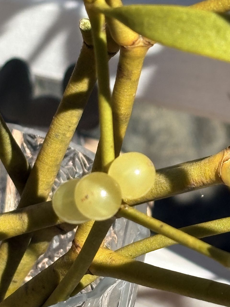 去年はお迎え出来なかったヤドリギ。今年はと楽しみに待っていました。届けて頂いた際に箱が潰れてしまいまして中の確認を・・と言われドキドキしながら確認。2、3粒ほど潰れてしまっていましたが大丈夫そうです。少し生けて楽しんでからスワッグにしようと思います☺️