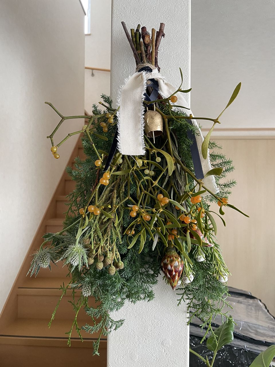 ヤドリギお初にお目にかかりました! いくらみたいな実!笑 こちらで購入したクリスマススワッグに付いていたリボンとベルをお借りしてスワッグにしました。 可愛いです。