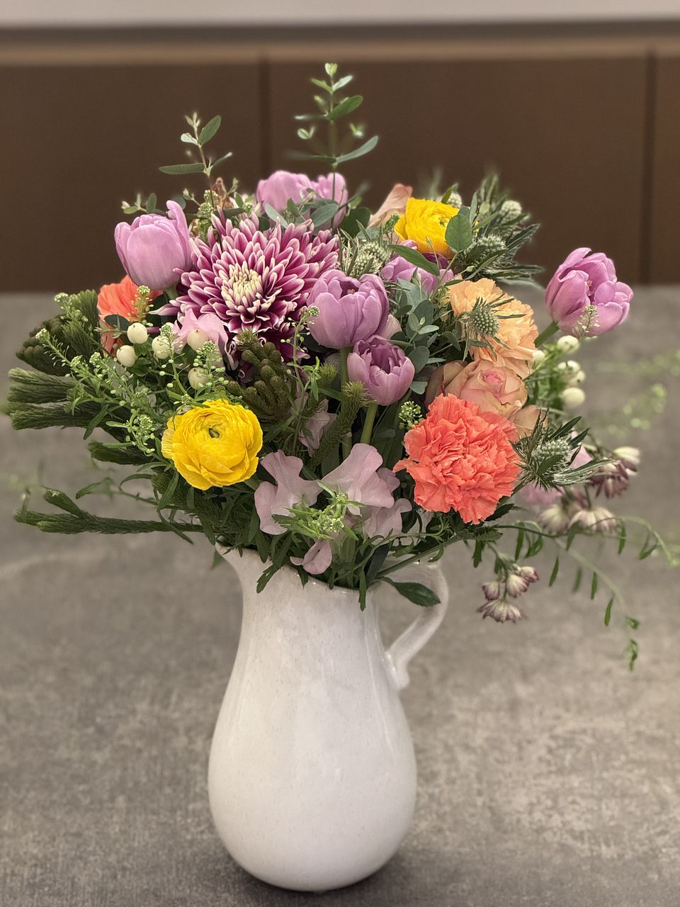 溢れる様なお花で、ボリュームたっぷり。存在感のあるマムや珍しい色のカーネーションとスイトピー。大変好評でした。 チューリップ🌷は、もう入らないので、別枠で飾りました。