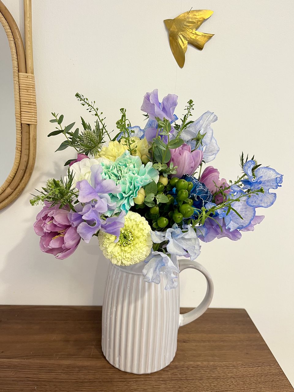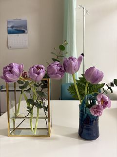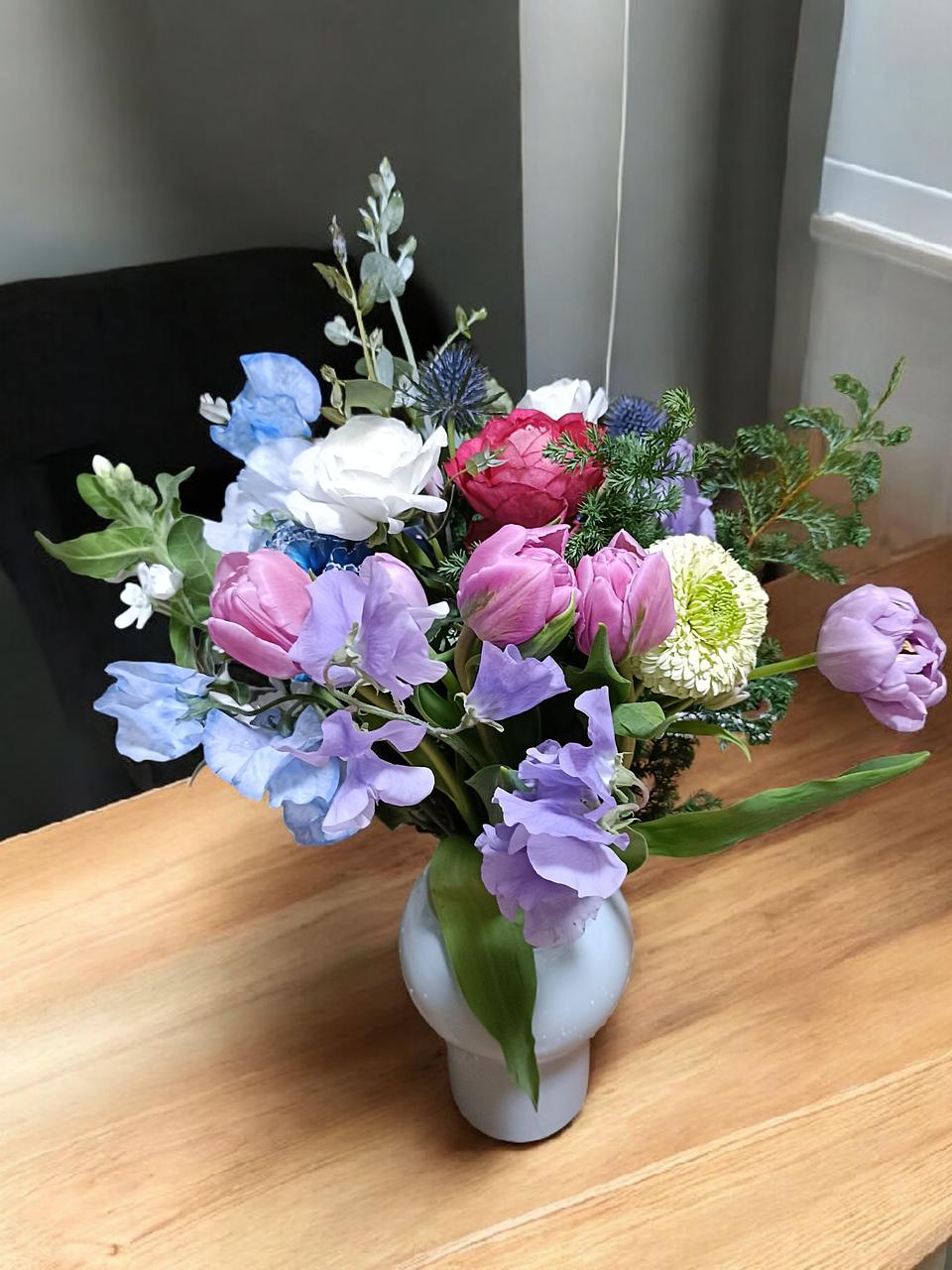 チューリップをメインに、冬らしいグリーンやブルー系のお花がうまくミックスされていて、斬新な感じで素敵でした。ボリュームがあるため、一度は1つに飾りましたが、その後3つに分けました。分けると全然違う雰囲気になり、本当にバランスよくスパイラルに組まれていたのがよくわかりました。これだけ本数が多いと、元気のないものが混ざっていることもありますが、今回全然気になるところはなかったです!迷っていたけど購入して良かったと思えるかわいいブーケでした🩷