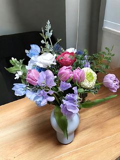 チューリップの他にガーベラなど お花がたくさん入っていて とても華やかでした。 フラワーベースから溢れ出しそうなブーケ✨ お部屋がパッと明るくなりました💖 ありがとうございました。