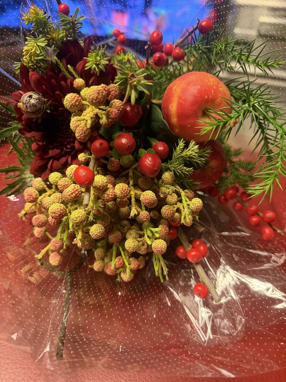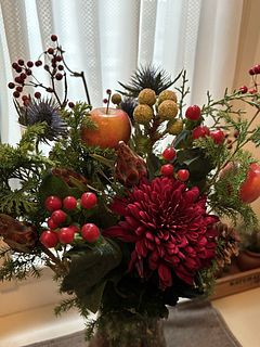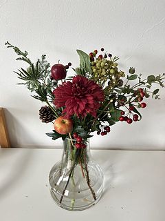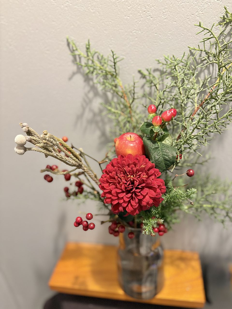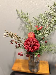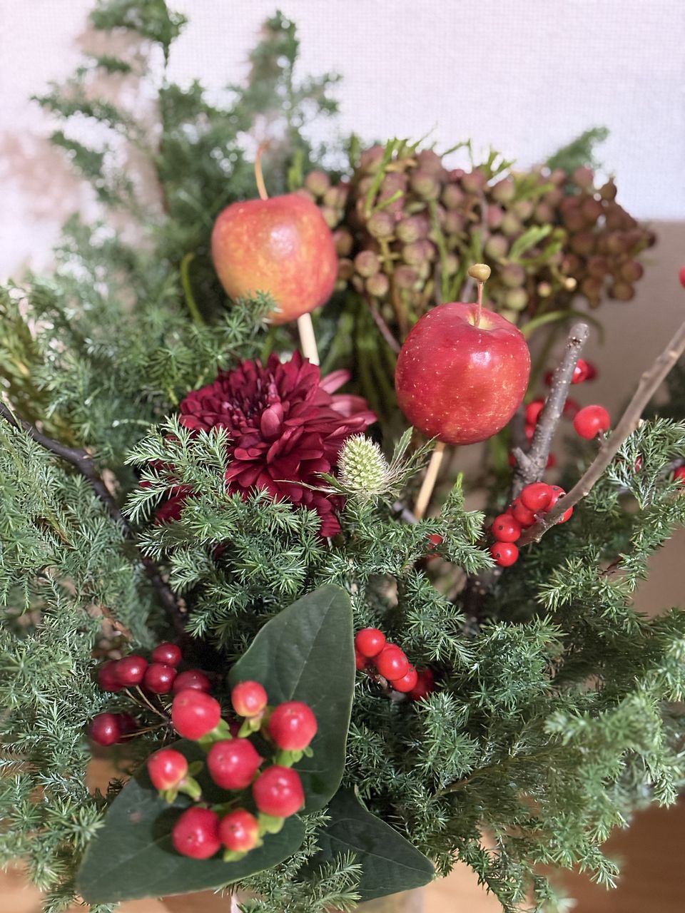 お花屋さんでりんごを花材として使ったアレンジは今まで見たことがなく、「りんごってこんなふうに飾れるんだ」と感心しました。