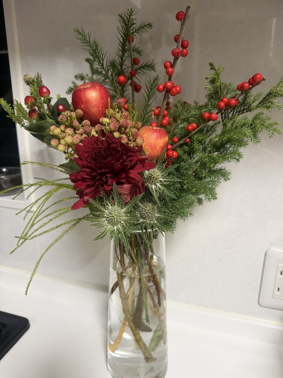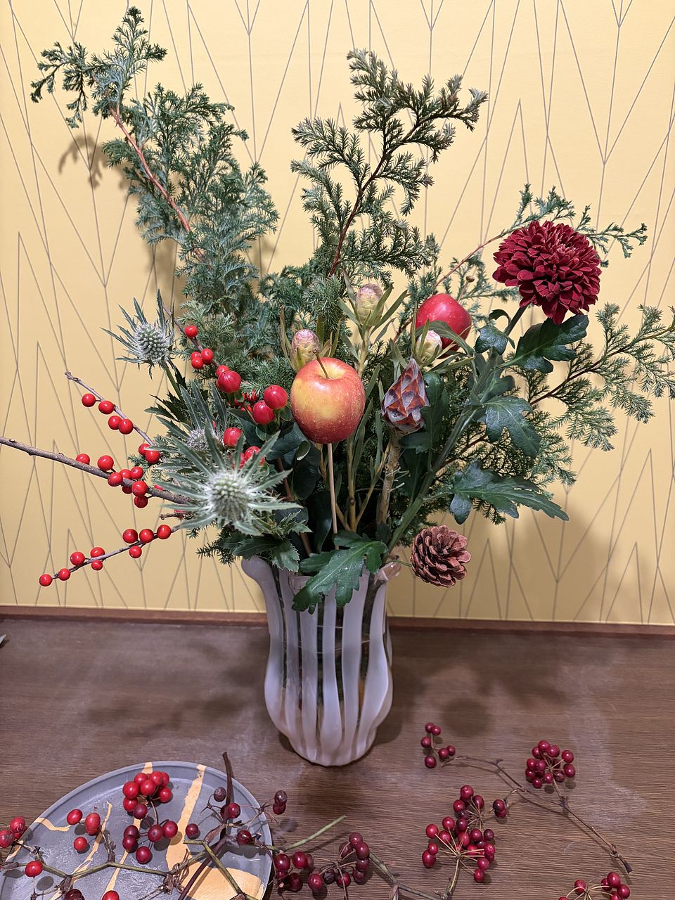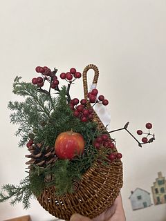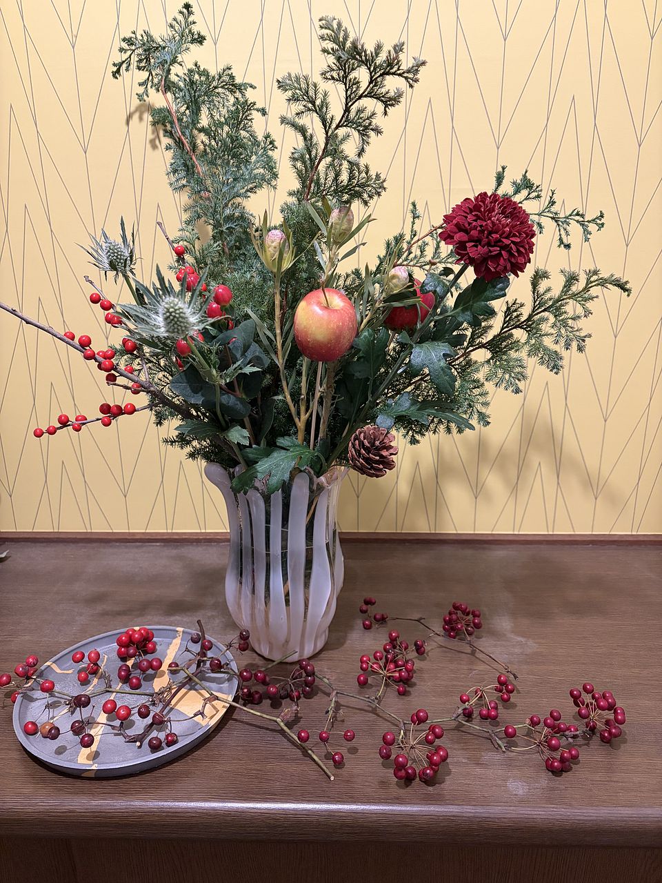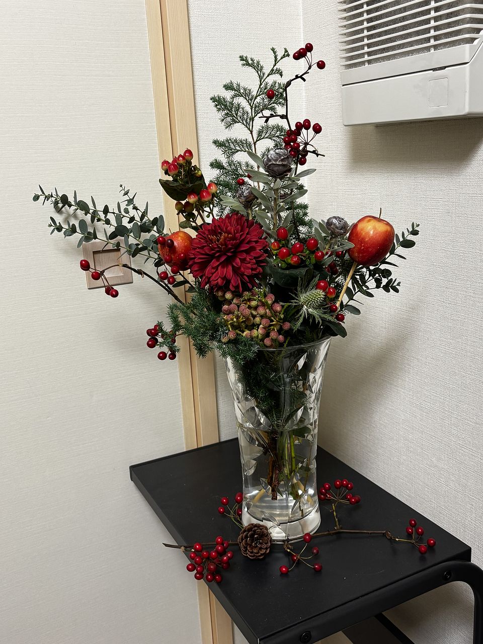 お花屋さんでりんごを花材として使ったアレンジは今まで見たことがなく、「りんごってこんなふうに飾れるんだ」と感心しました。
