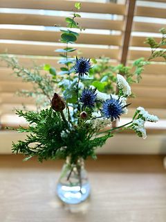 ブルーアイスやにおいひばを中心に、ユーカリやエリンジウムなど、清々しいグリーンと凛とした草花を合わせました。まるで森林の中で眠るような安らぎを感じられるスワッグ🛏️💤