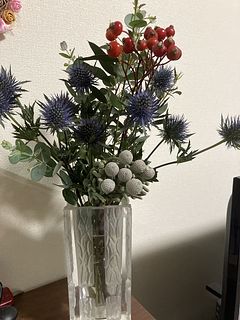 ユーカリモサモサエリンジウムもたっぷり。赤い実も可愛かった♪玄関に飾ったら、フワッとユーカリの香りがして清々しい空間になりました。 生花で楽しんだあとドライにして楽しみたいと思います。