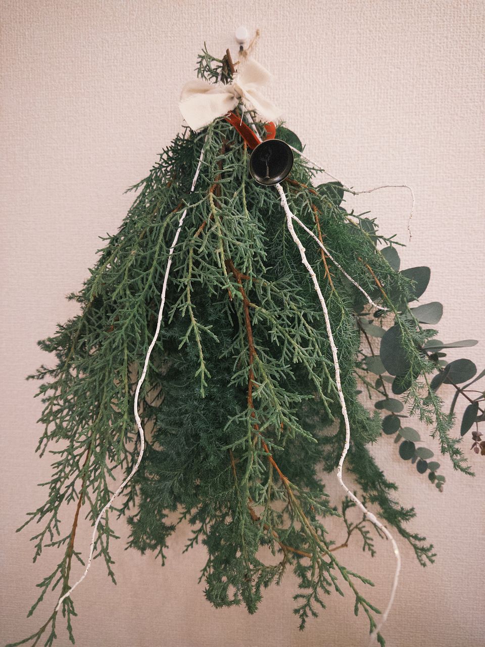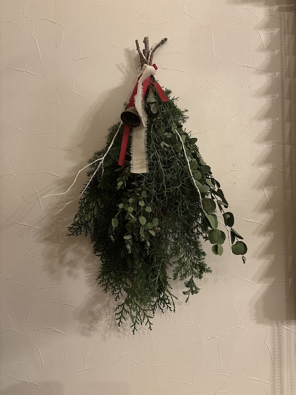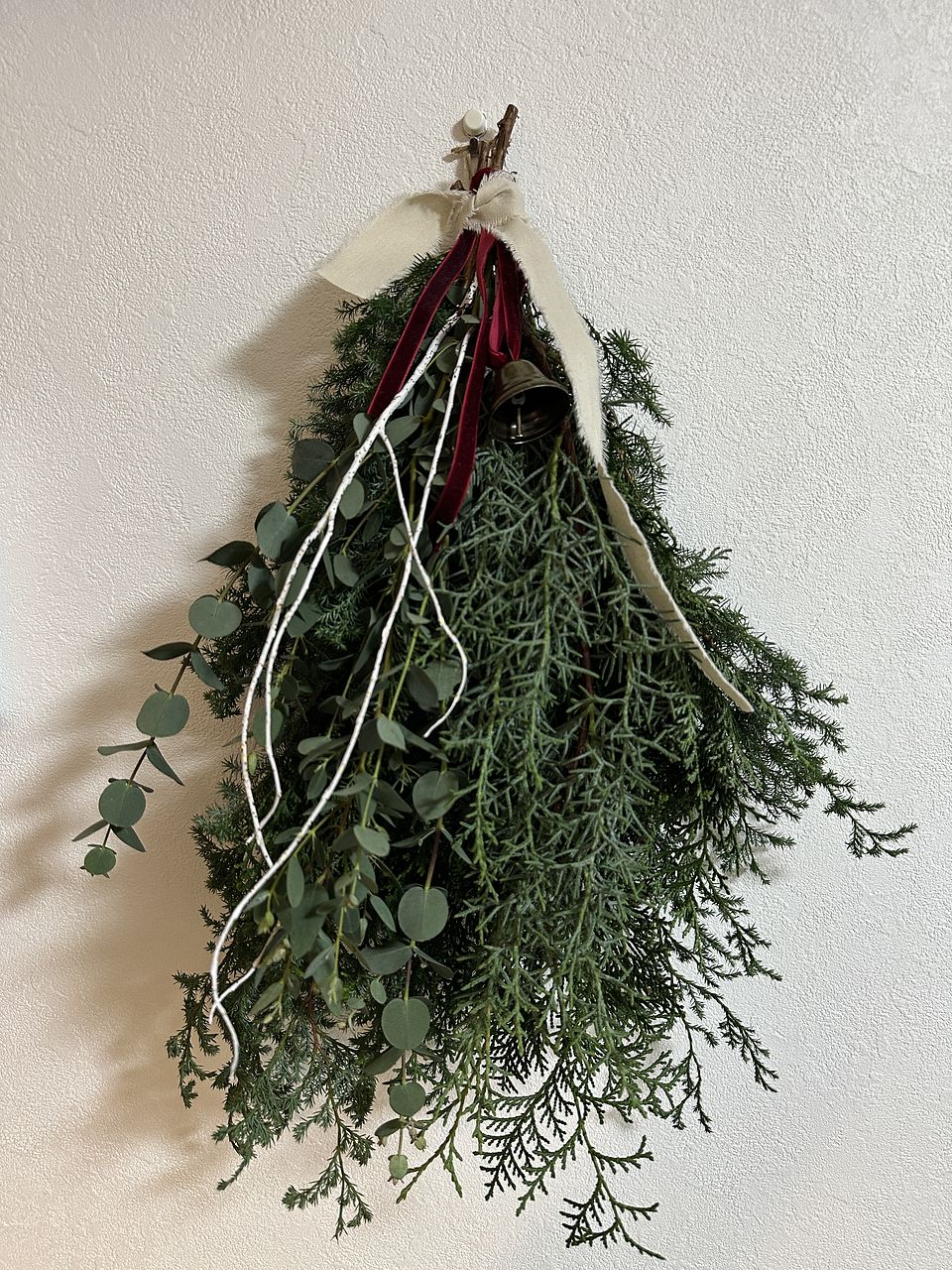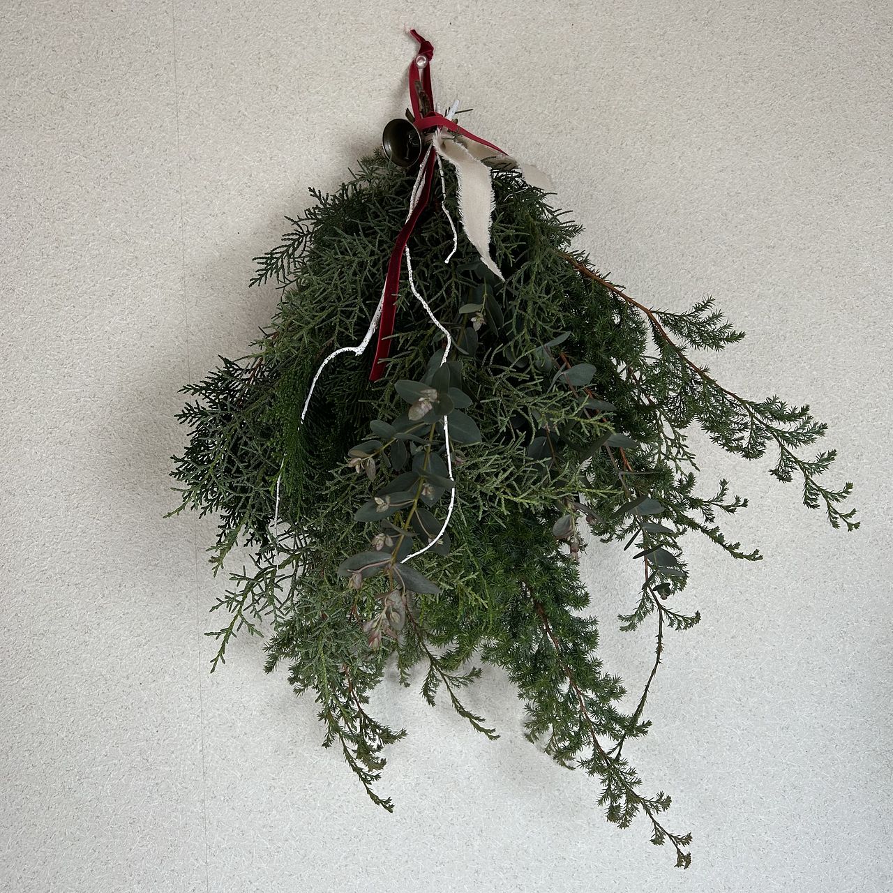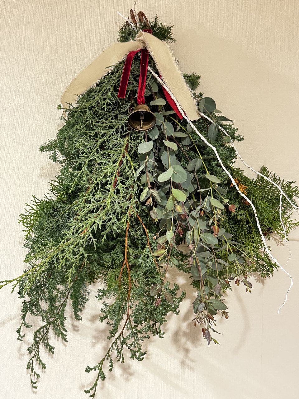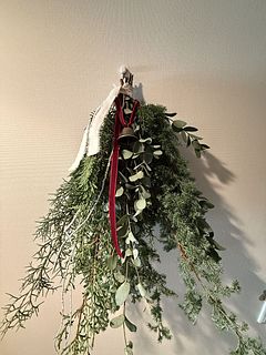 ボリュームたっぷりで素敵なスワッグが出来ました!リボンとベルでクリスマス感が増していいですね。家のユーカリを忍ばせてみましたが無くてよかったかも。白い枝2本は見本のような曲がりがなく真っ直ぐでしたのでうまく活用できませんでした。