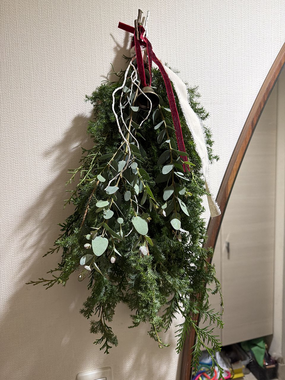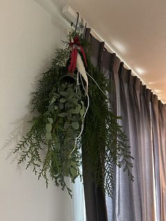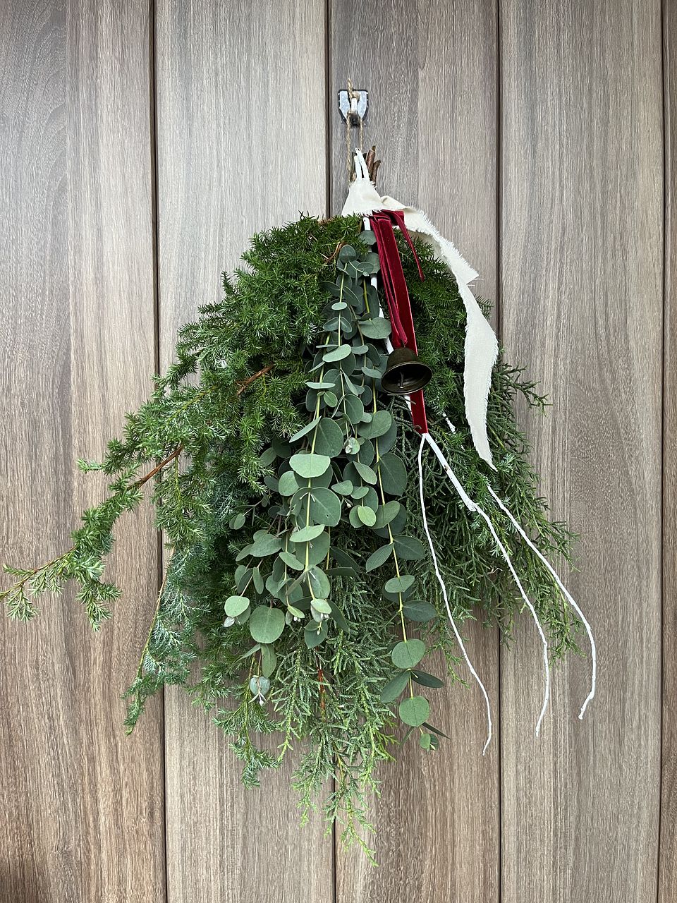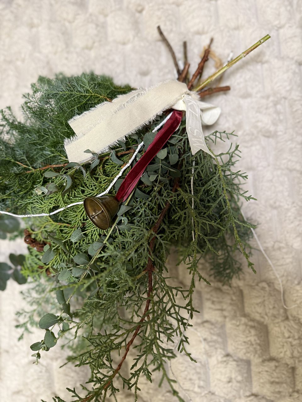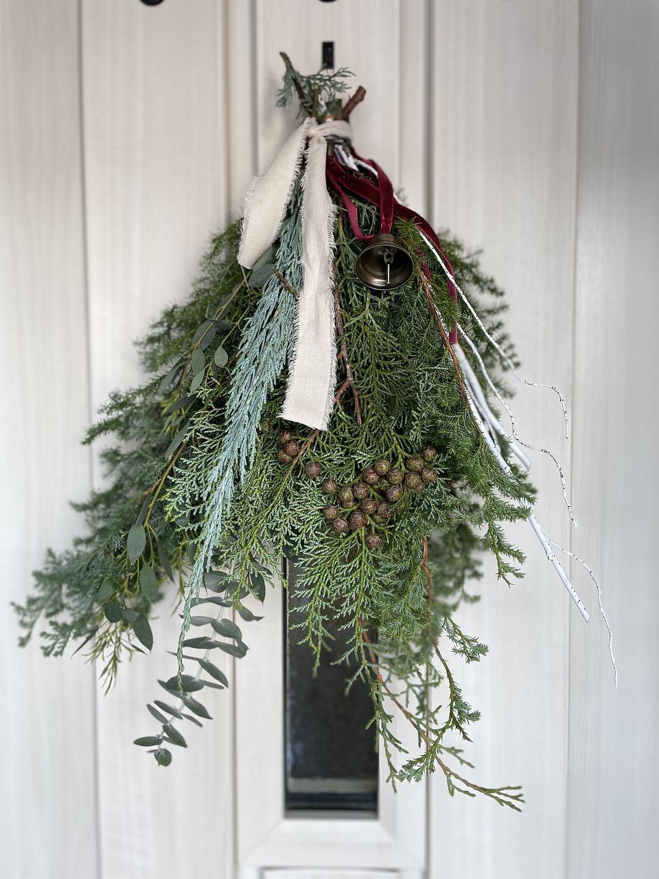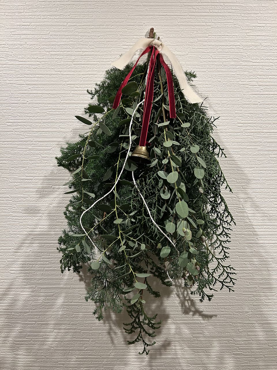 ボリュームたっぷりで素敵なスワッグが出来ました!リボンとベルでクリスマス感が増していいですね。家のユーカリを忍ばせてみましたが無くてよかったかも。白い枝2本は見本のような曲がりがなく真っ直ぐでしたのでうまく活用できませんでした。
