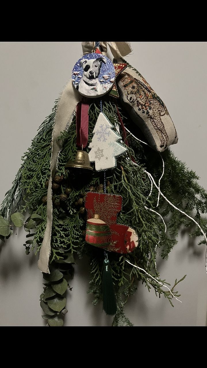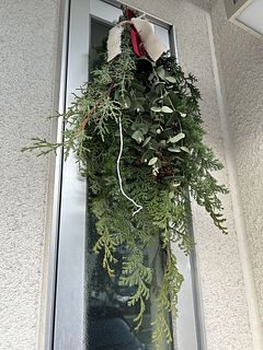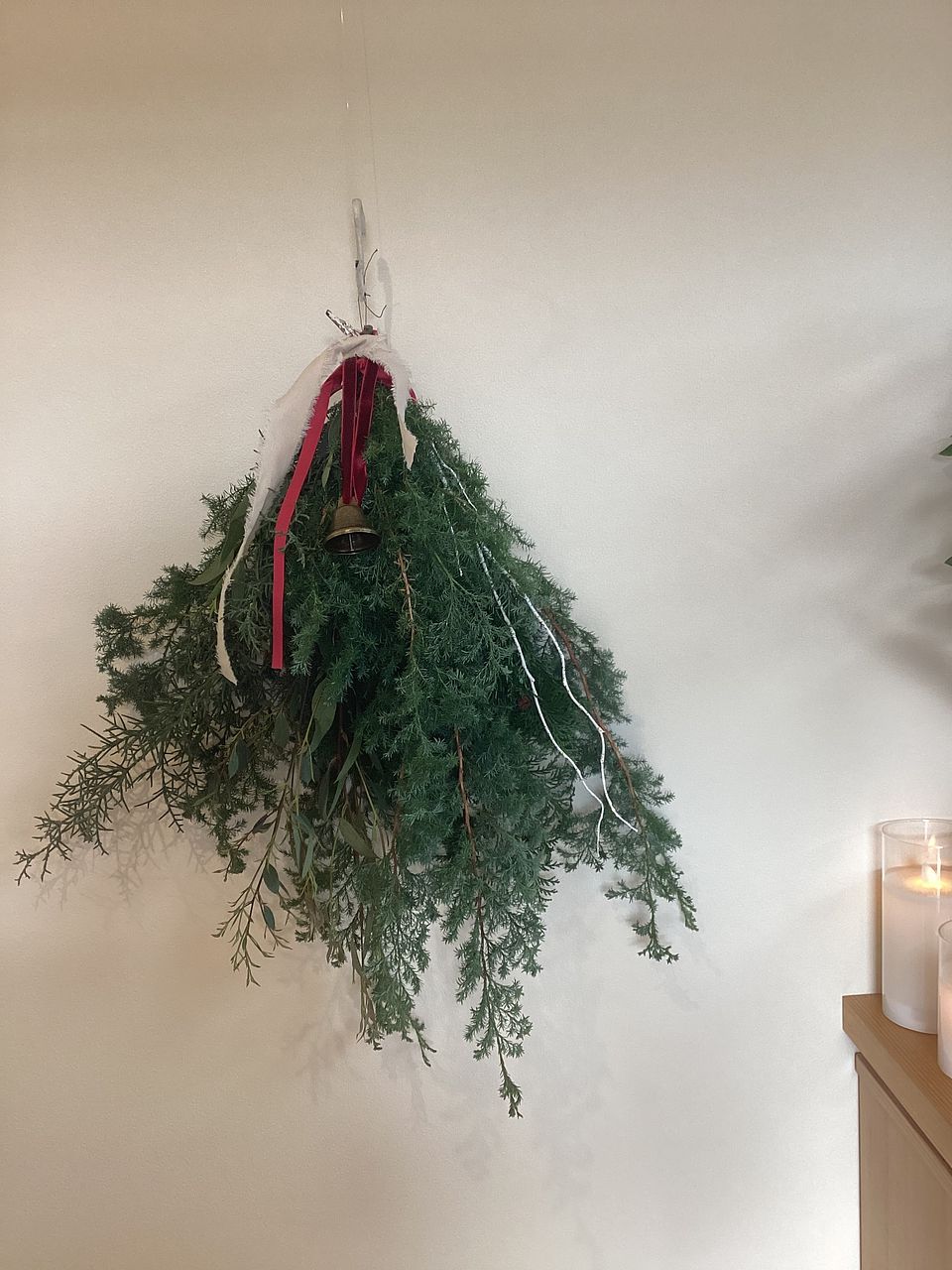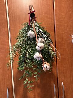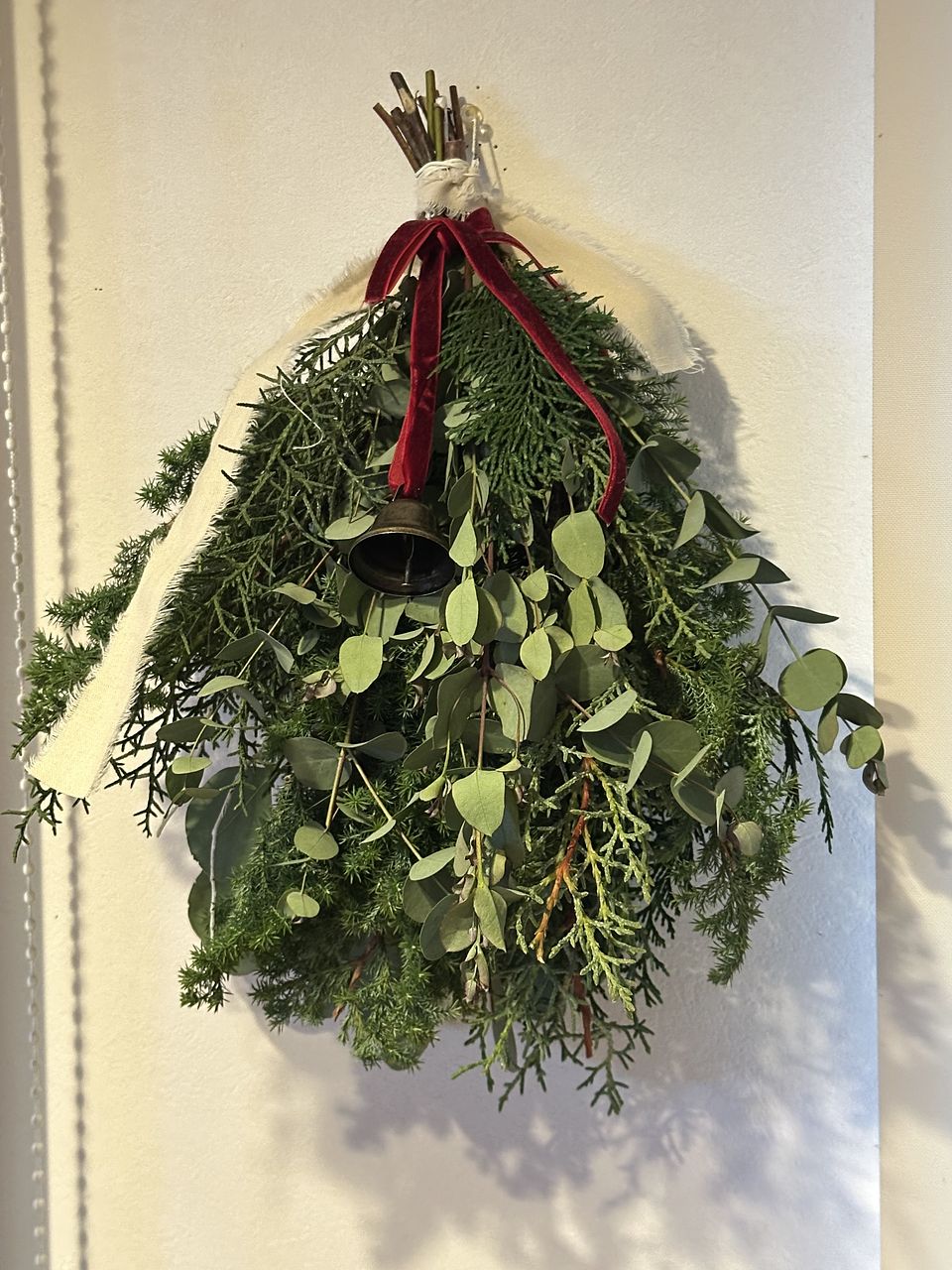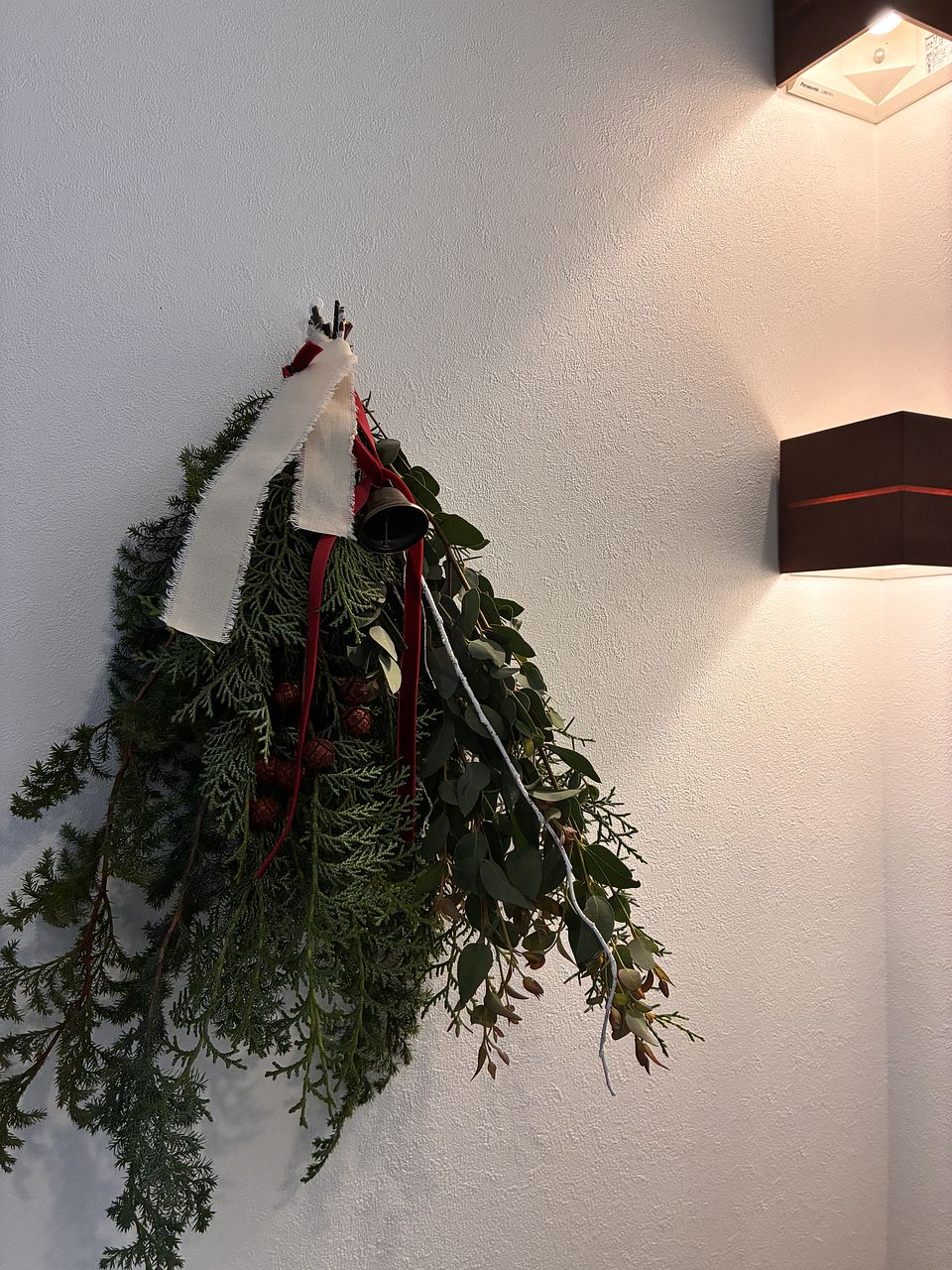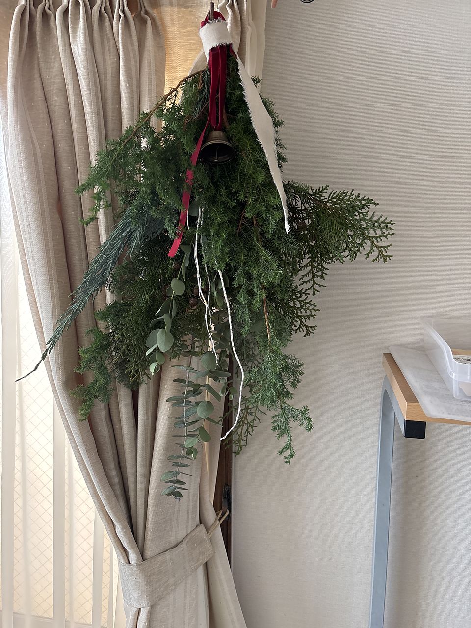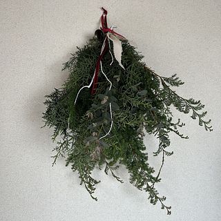 ボリュームたっぷりで素敵なスワッグが出来ました!リボンとベルでクリスマス感が増していいですね。家のユーカリを忍ばせてみましたが無くてよかったかも。白い枝2本は見本のような曲がりがなく真っ直ぐでしたのでうまく活用できませんでした。