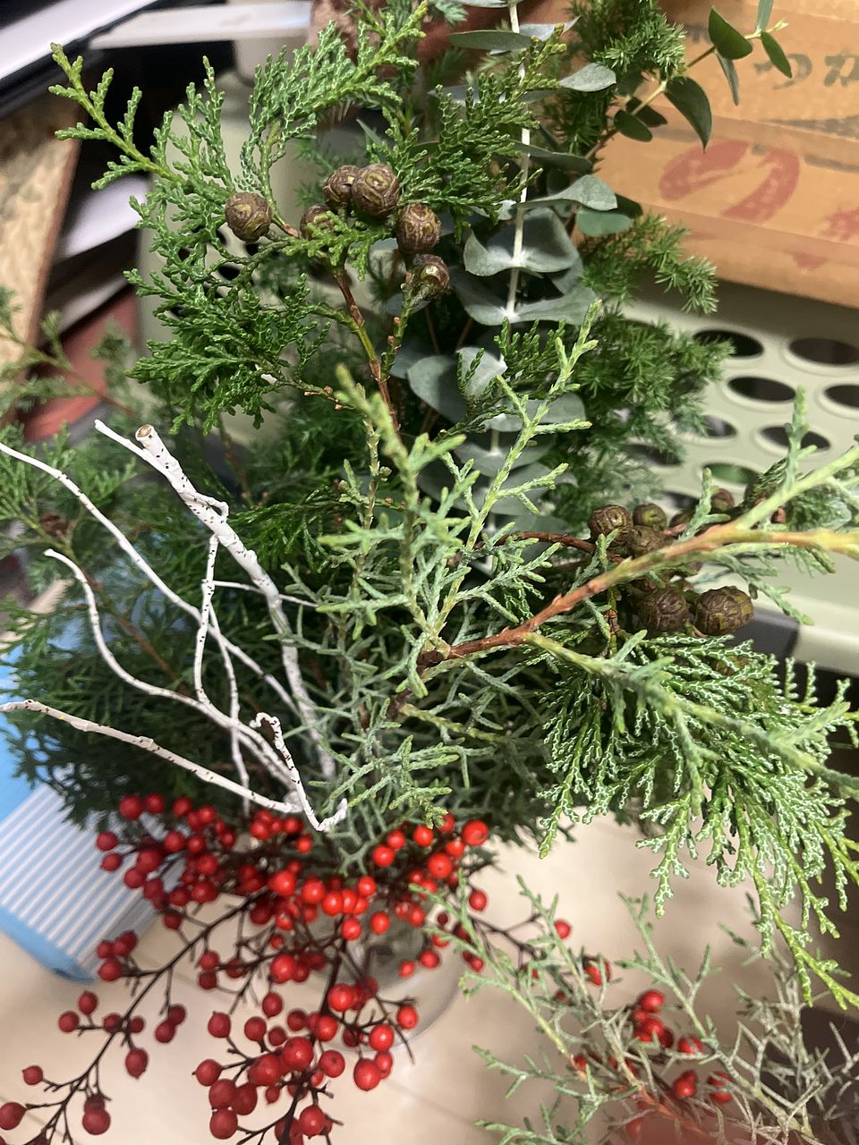 ボリュームタップリでスワッグにしたものと、 枝を別の花瓶に入れてツリーにしました🎄 自宅にあった赤い実がついた枝も足してお部屋がすごくホリデー感に包まれました✨
